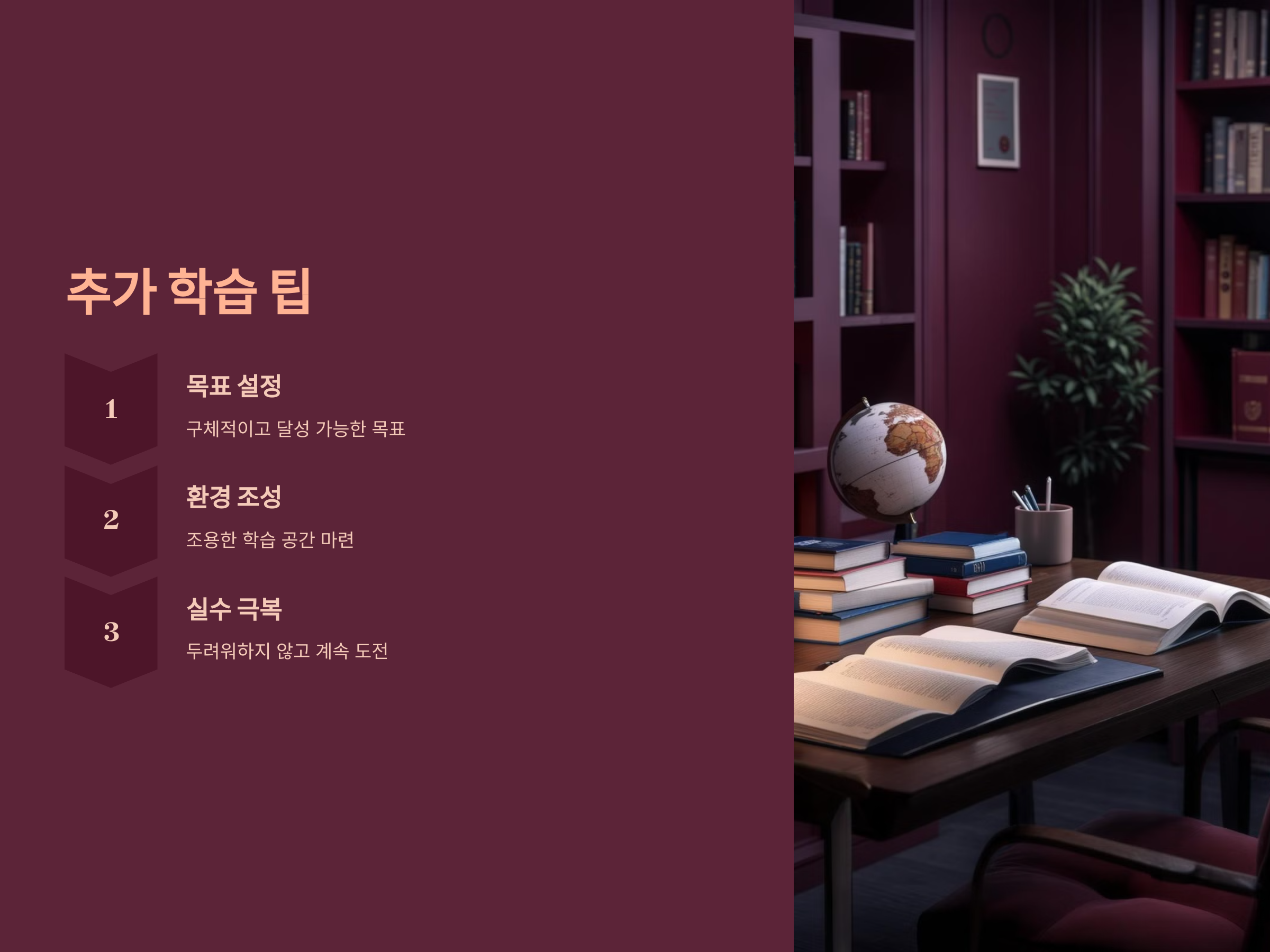 학습에 집중할 수 있는 조용한 환경을 만드는 것이 좋습니다. 나만의 학습 공간을 마련하고, 가능한 한 외부의 방해를 받지 않도록 하세요. 또한, 영어로 된 책이나 노트, 플래시카드 등을 준비하여 언제든지 복습할 수 있도록 합니다.