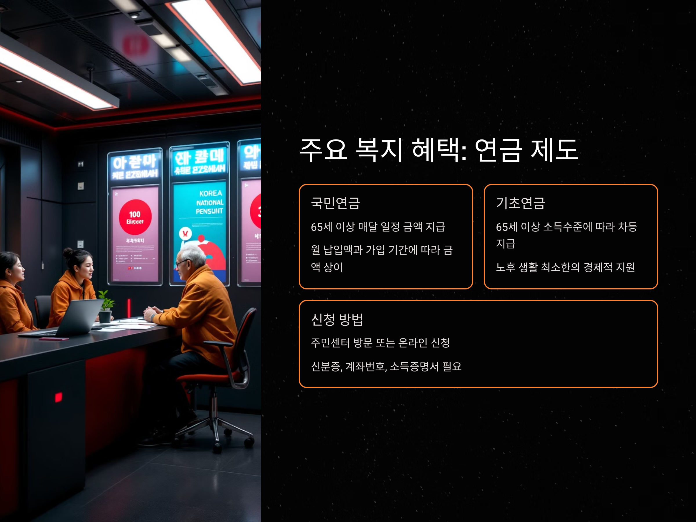 신청 방법: 기초연금 신청은 주민센터나 온라인 복지포털을 통해 가능하며, 신청 시 가구 소득을 증명하는 서류가 필요합니다.