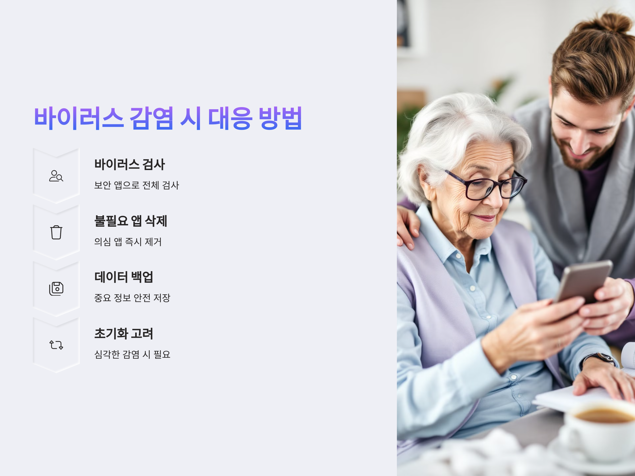 이러한 증상이 나타난다면 즉시 스마트폰을 점검하고, 신뢰할 수 있는 보안 앱을 통해 바이러스를 검사해야 합니다. 또한, 불필요한 앱을 삭제하고, 스마트폰을 초기화하여 데이터를 정리하는 것이 좋습니다. 하지만 초기화 전에는 중요한 데이터를 백업해 놓는 것이 필수입니다.