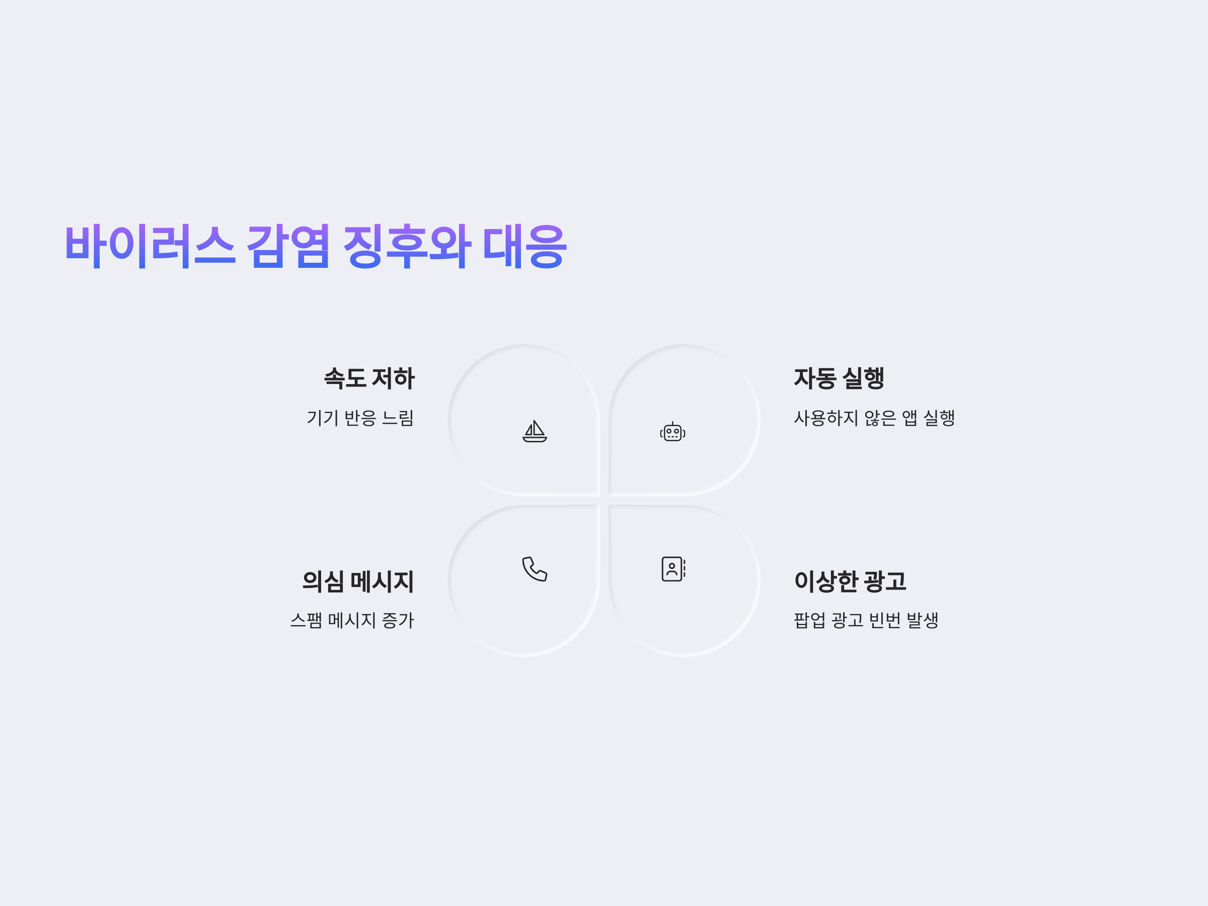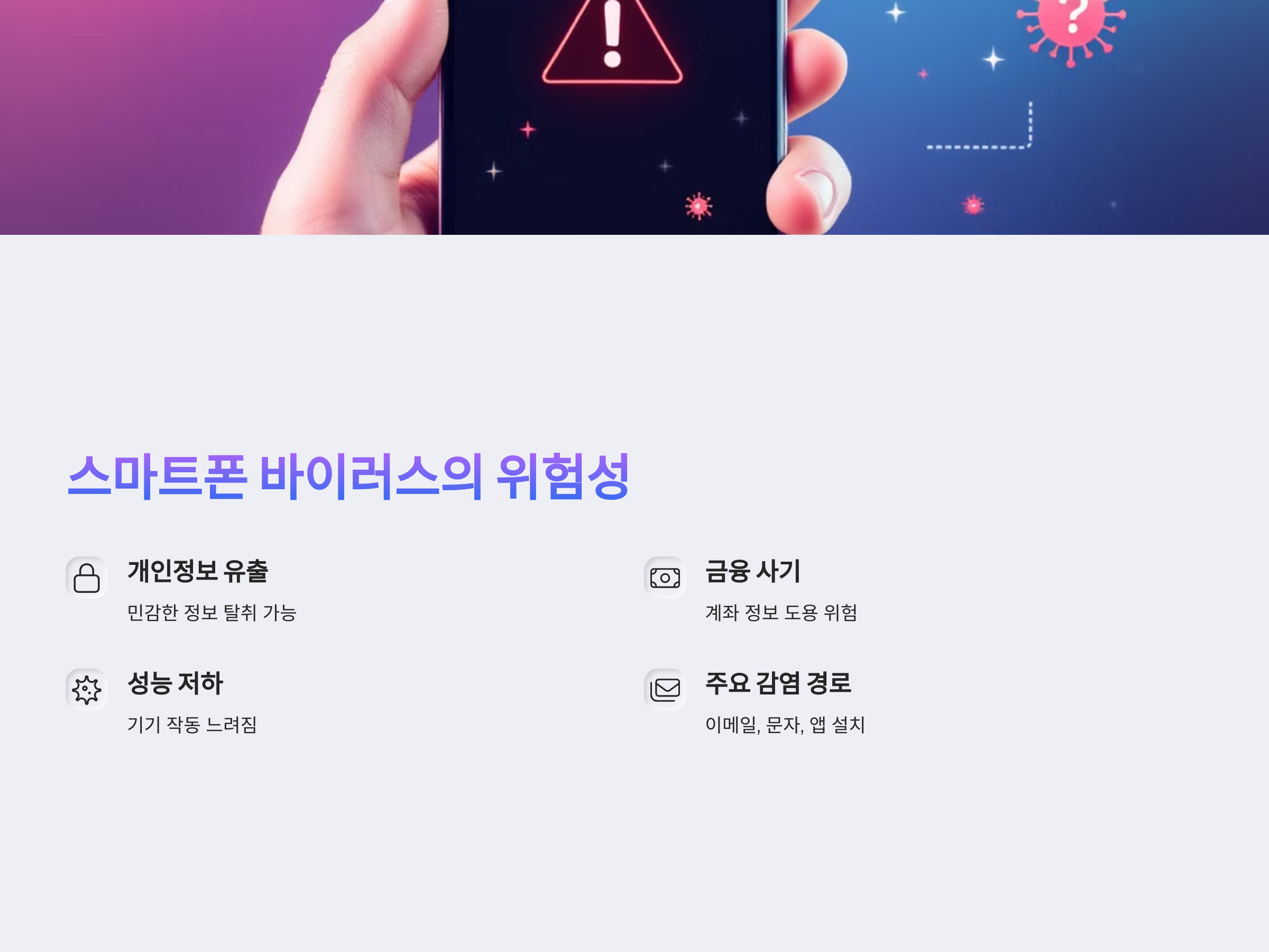 스마트폰을 사용하면서 경험할 수 있는 바이러스 감염은 개인 정보 유출, 금융 사기, 그리고 불필요한 광고와 같은 문제를 유발할 수 있습니다. 특히 고령층은 기술적인 부분에서 미숙할 수 있어 이러한 바이러스와 악성 프로그램에 쉽게 노출될 수 있습니다. 스마트폰 바이러스는 주로 이메일, 문자 메시지, 앱 설치 등 다양한 경로로 전파됩니다. 바이러스에 감염되면 스마트폰의 성능이 저하되고, 개인 정보가 유출될 수 있어 큰 위험이 될 수 있습니다.