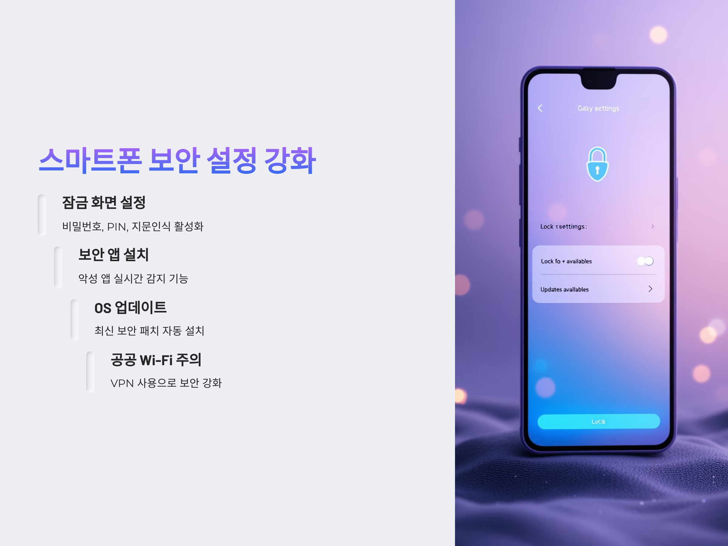 스마트폰의 보안 설정을 강화하는 것도 매우 중요합니다. 고령층 사용자들이 놓치기 쉬운 보안 설정을 살펴보겠습니다. 첫째, 스마트폰의 잠금 화면을 설정해야 합니다. 비밀번호, PIN 코드, 또는 지문 인식을 사용하여 다른 사람이 스마트폰을 함부로 사용하지 못하도록 해야 합니다.