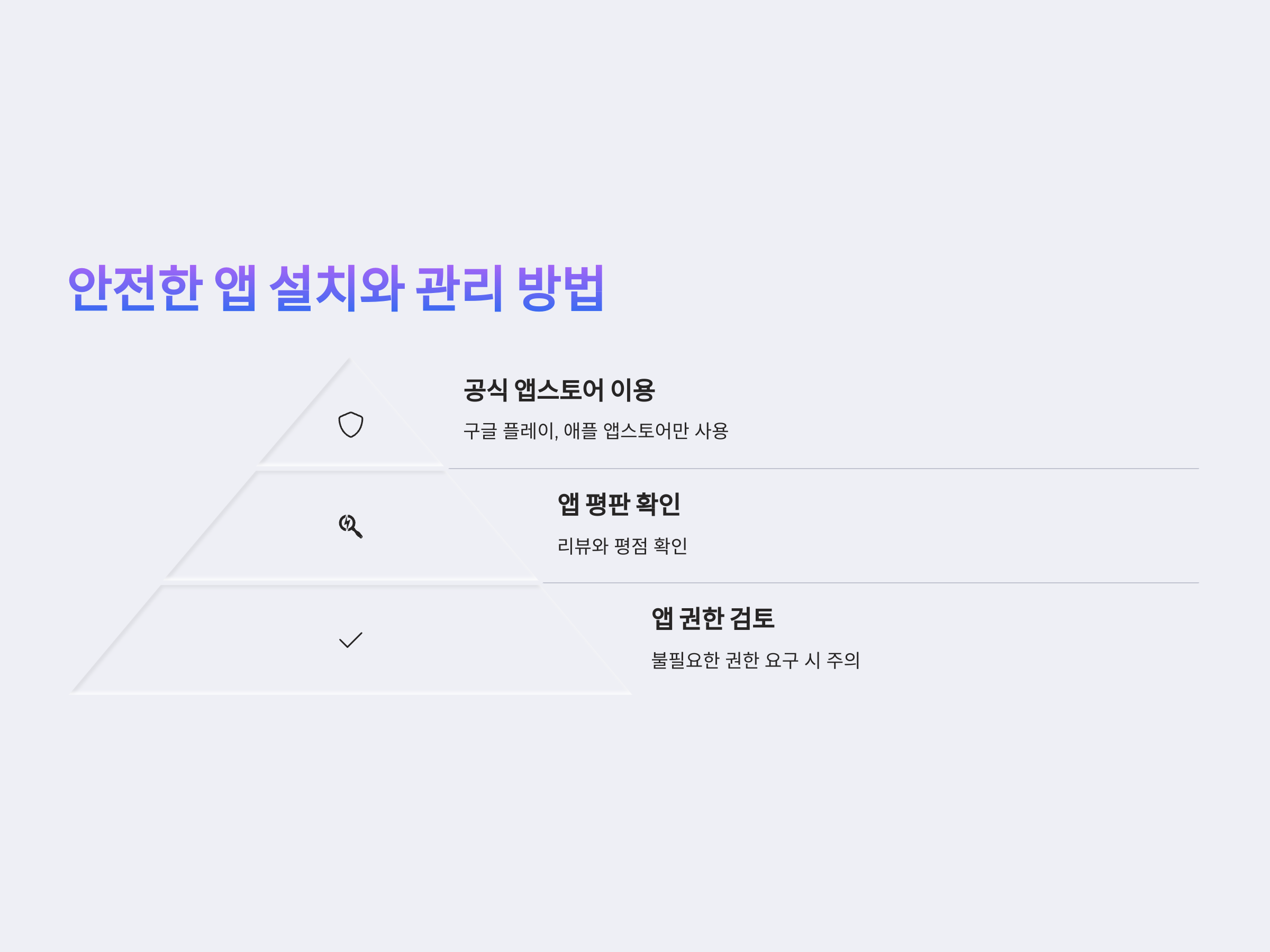 스마트폰에서 가장 중요한 예방 조치 중 하나는 안전한 앱 설치입니다. 구글 플레이 스토어나 애플 앱스토어와 같은 공식 마켓에서만 앱을 다운로드하는 것이 가장 안전합니다. 공식 마켓 외의 출처에서 앱을 다운로드하면 바이러스나 악성 소프트웨어에 감염될 위험이 크게 증가합니다.