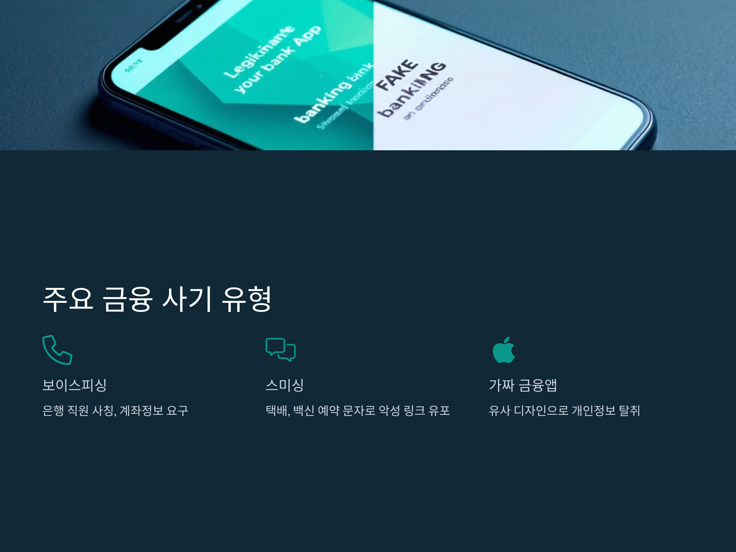 - 가짜 금융앱 유포: 실제 금융기관의 앱과 유사한 디자인으로 가짜 앱을 설치하게 유도하여 개인정보 및 금융 정보를 빼돌리는 방식.