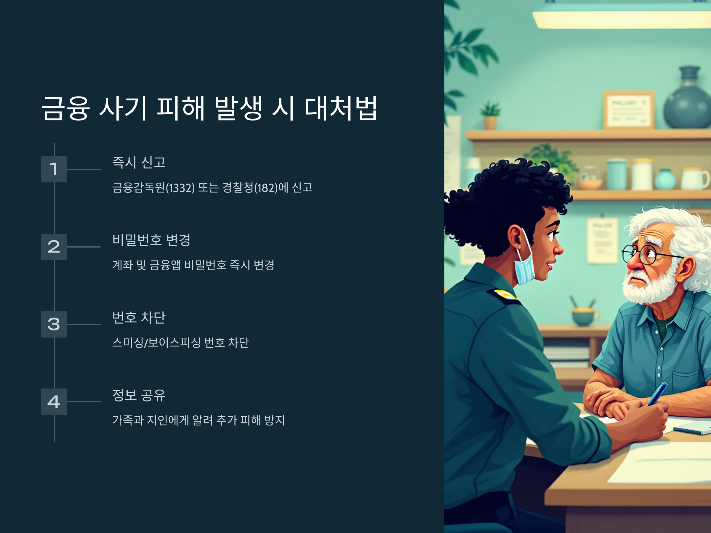 만약 금융 사기의 피해를 입었다면 신속한 대처가 중요합니다. 피해 발생 시 다음 단계를 따라야 합니다.