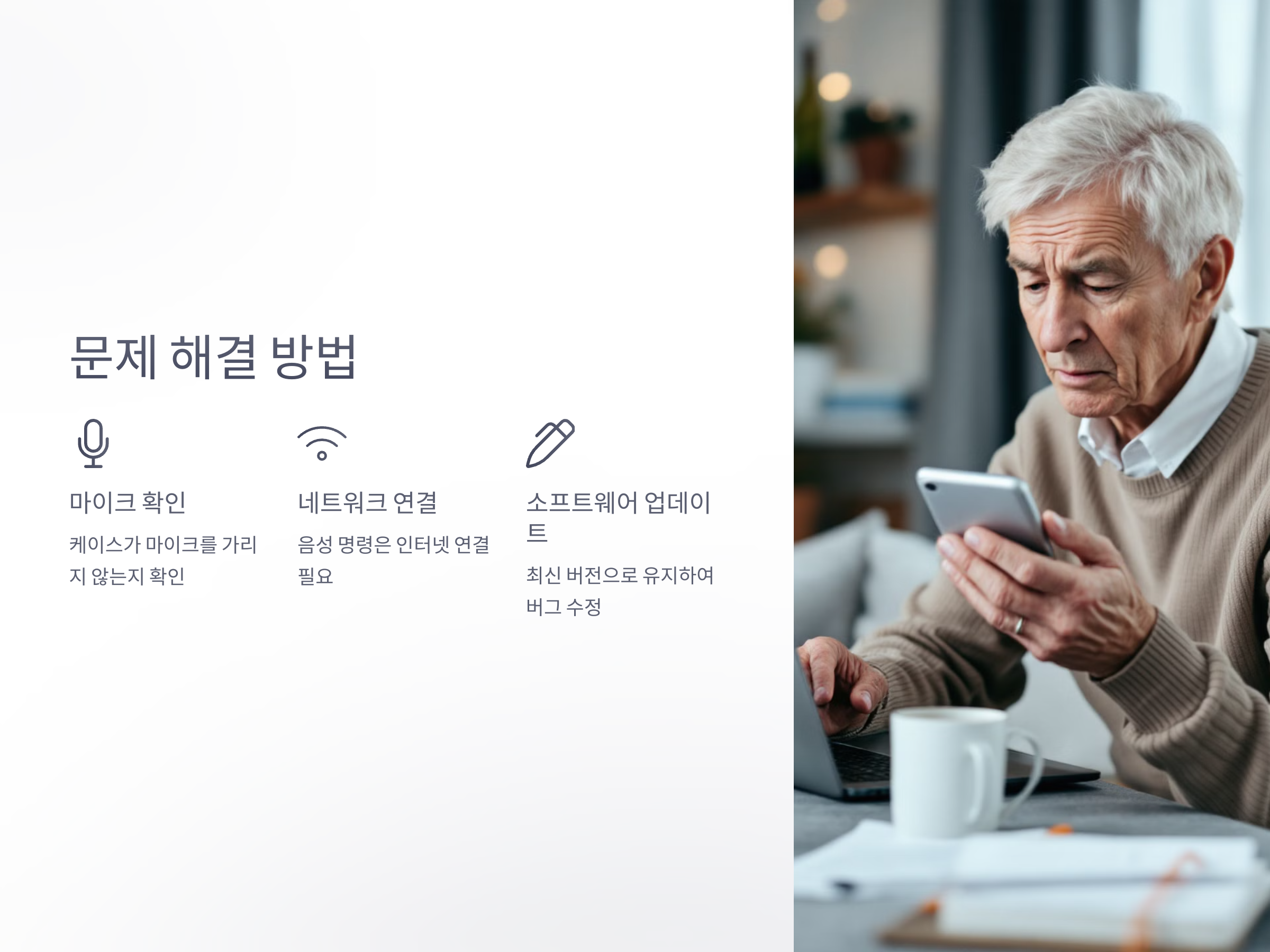 고령층이 스마트폰을 사용할 때 가장 불편함을 느끼는 점 중 하나는 작은 글씨와 복잡한 인터페이스입니다. 하지만 음성 명령을 활용하면 직접 터치하지 않고도 원하는 작업을 수행할 수 있어 매우 유용합니다.