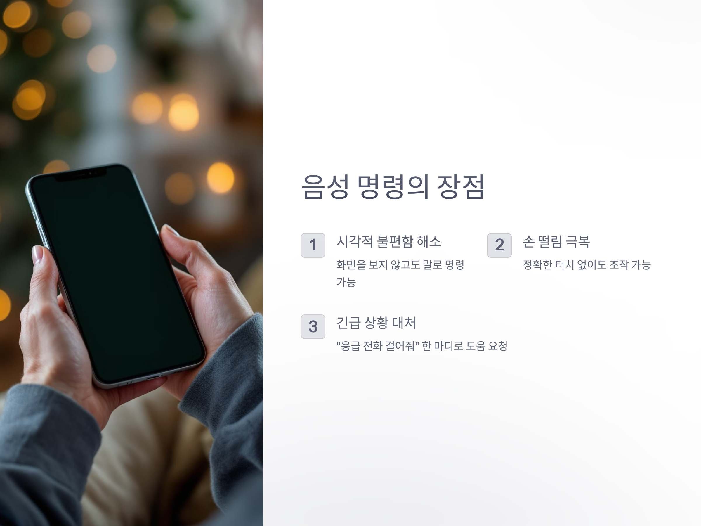 - 손이 떨려도 OK: 정확한 터치가 어려운 경우에도 음성만으로 조작 가능.