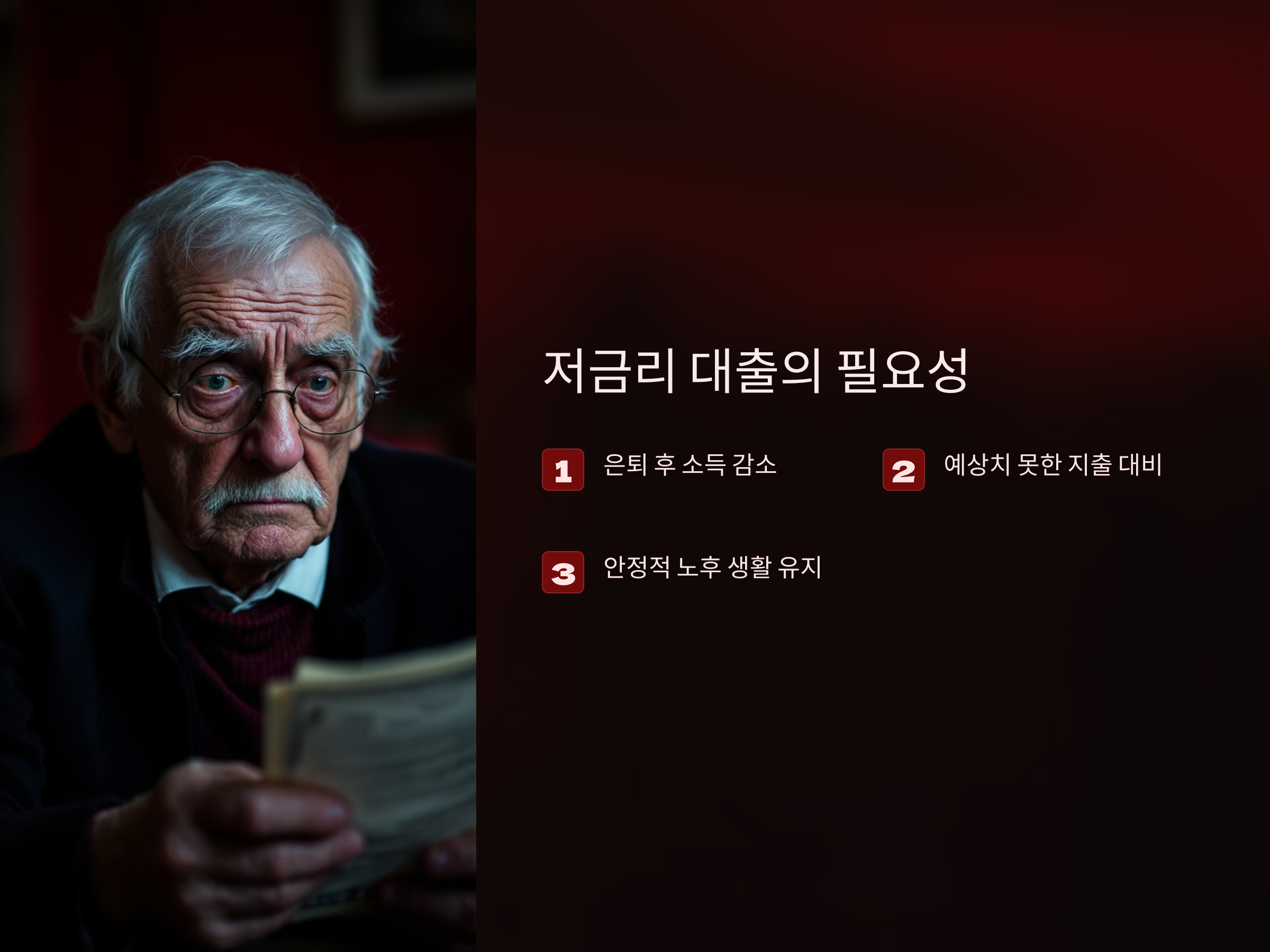 고령층은 은퇴 이후 정기적인 소득이 감소하거나 중단되는 경우가 많습니다. 이에 따라 예상치 못한 의료비나 생활비 지출이 발생할 때 재정적인 어려움을 겪을 수 있습니다. 이러한 상황에서 저금리 대출 상품은 고령자들이 경제적 부담을 덜고 안정적인 노후 생활을 유지하는 데 큰 도움이 됩니다. 또한, 저금리 대출을 통해 기존의 고금리 부채를 상환하거나 주거 환경을 개선하는 등 다양한 재정적 목표를 달성할 수 있습니다.