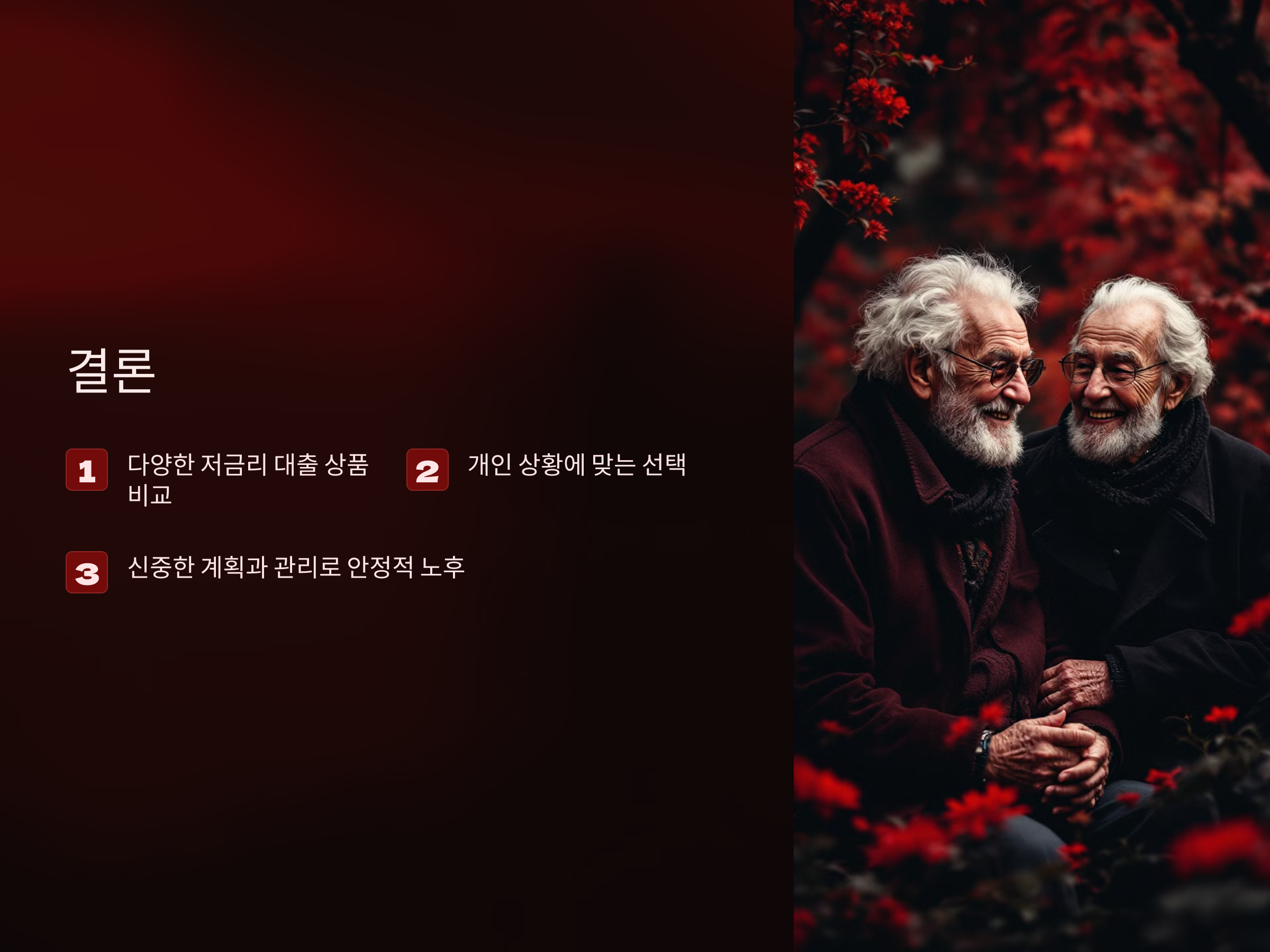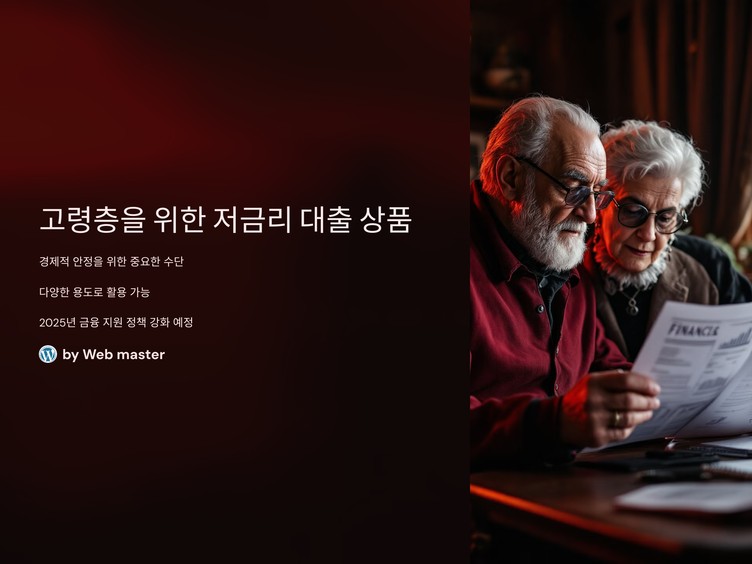 고령층을 위한 저금리 대출 상품은 다양한 형태로 제공되고 있으며, 이를 통해 경제적 안정을 도모할 수 있습니다. 정부와 금융 기관에서 제공하는 여러 상품을 비교하고, 개인의 상황에 맞는 최적의 대출을 선택하는 것이 중요합니다. 대출 신청 전후로 신중한 계획과 철저한 신용 관리로 안정적인 노후 생활을 영위하시길 바랍니다.