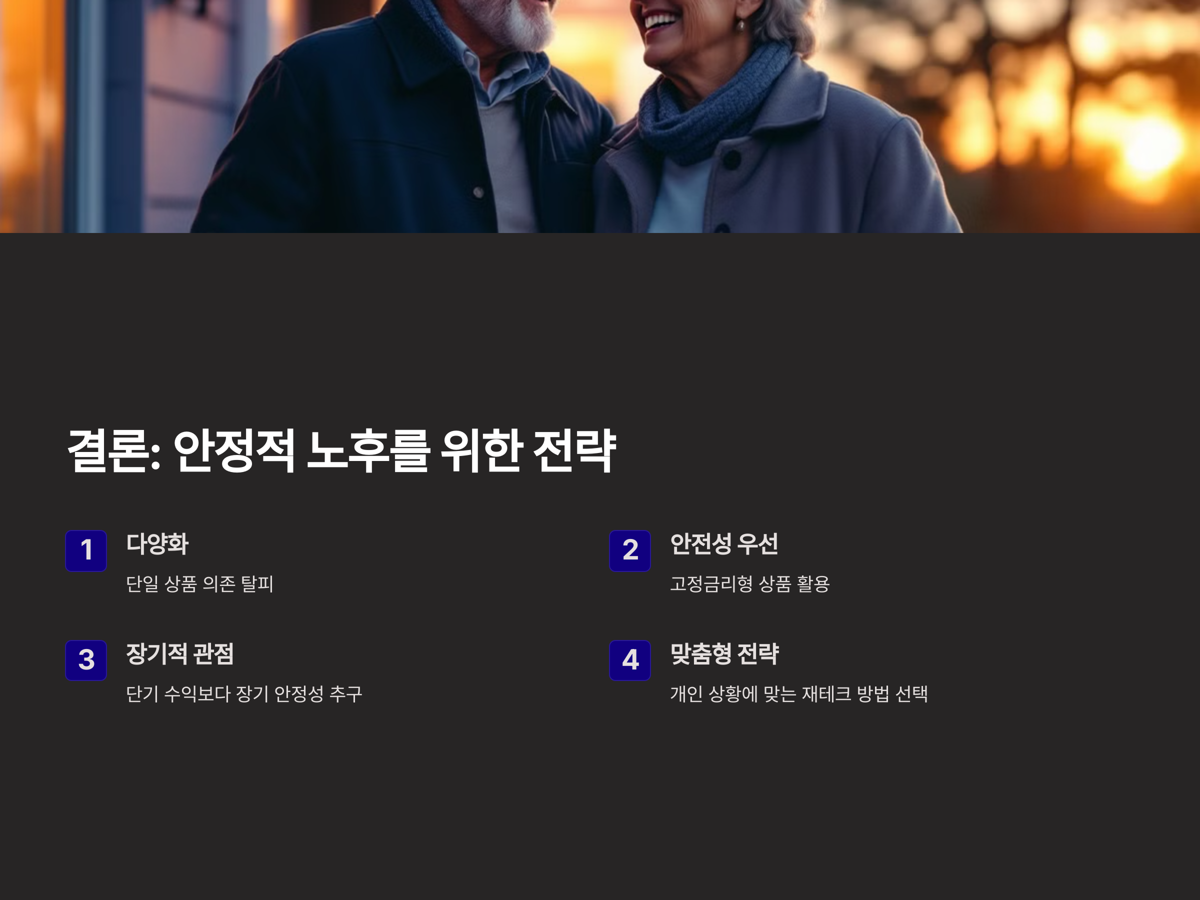 장기적인 관점에서 다양한 투자 상품을 결합하여, 리스크를 최소화하면서도 안정적인 수익을 추구하는 것이 고령층의 재테크 전략에 가장 적합합니다. 다양한 방법을 비교하고 자신에게 맞는 전략을 찾아 실천하는 것이 필요합니다.