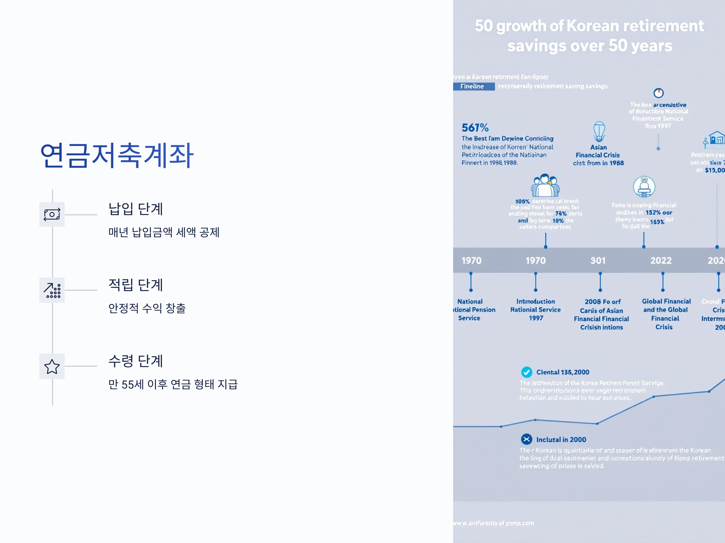 연금저축계좌는 만 55세 이후부터 연금을 수령할 수 있으며, 세액 공제 외에도 연금 수령 시 세금을 최소화할 수 있는 장점이 있습니다. 특히, 고령층은 이 상품을 통해 노후 자금을 안정적으로 확보할 수 있습니다.