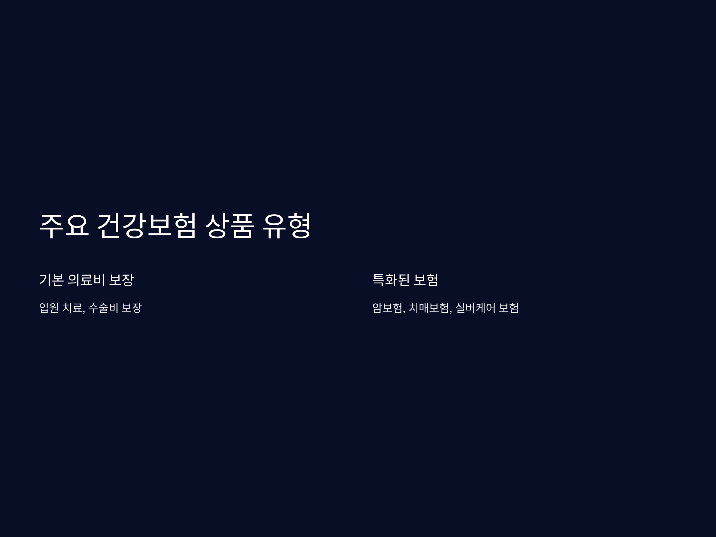 고령층을 위한 건강보험 상품은 크게 두 가지로 나눠볼 수 있습니다. 첫 번째는 기본적인 의료비를 보장하는 상품입니다. 이는 입원 치료, 수술비 등을 보장하는 일반적인 건강보험입니다. 두 번째는 특화된 보험으로, 고령층에 특화된 암보험, 치매보험, 실버케어 보험 등이 있습니다. 이러한 보험들은 나이가 들수록 발생할 수 있는 특수한 질병에 대한 보장을 제공합니다.