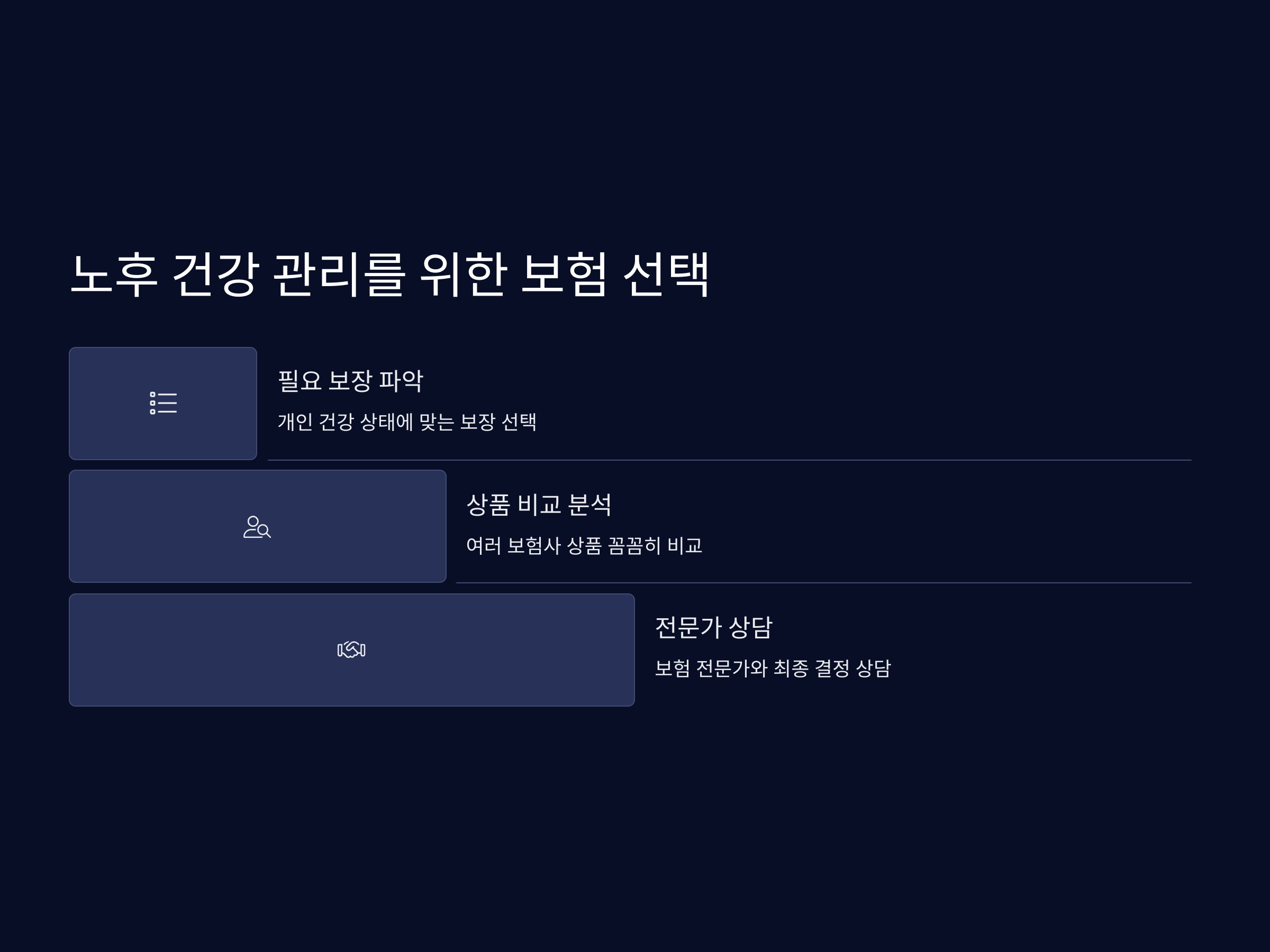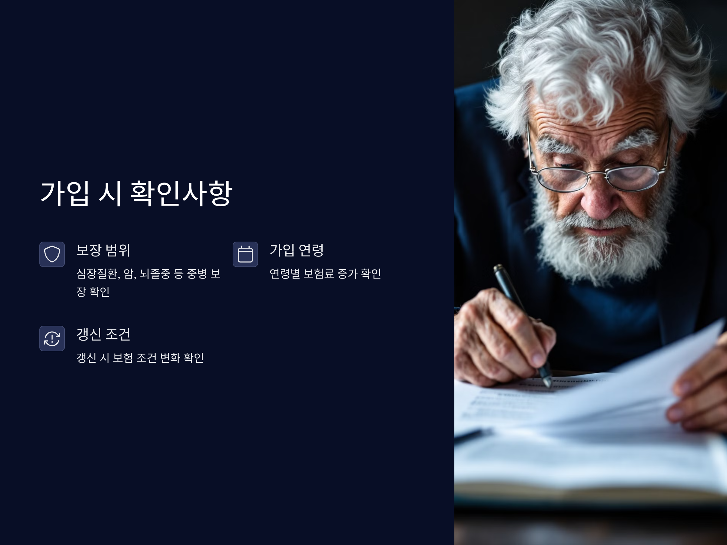 건강보험 가입을 고려할 때 중요한 것은 보장 범위입니다. 고령층은 심장 질환, 암, 뇌졸중 등 다양한 중병에 취약해지기 때문에, 이를 보장하는 상품을 우선적으로 고려해야 합니다. 또, 보험의 가입 연령과 갱신 조건을 확인하는 것이 중요합니다. 나이가 많을수록 보험료가 증가하고, 갱신 시 보험 조건이 달라질 수 있기 때문입니다.