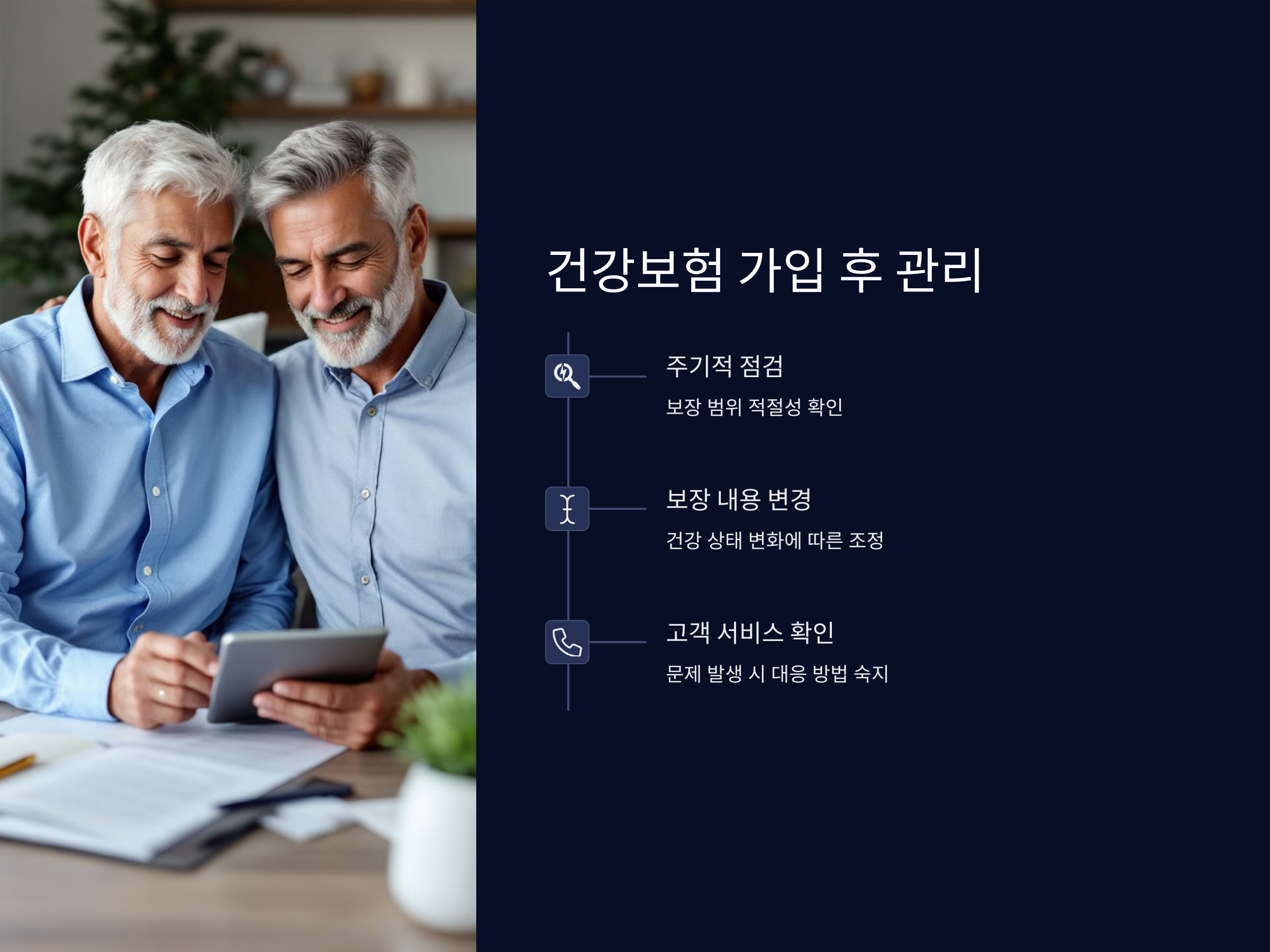 보험에 가입한 후에는 주기적으로 보험 상품의 내용을 확인하고, 보장 범위가 적절한지 점검하는 것이 중요합니다. 또한, 건강 상태가 변할 때마다 보장 내용을 변경하거나 추가할 필요가 있을 수 있습니다. 보험사의 고객 서비스와 보험금 청구 절차가 효율적인지도 확인하고, 문제가 생길 경우 바로 대응할 수 있는 방법을 알아두는 것이 좋습니다.