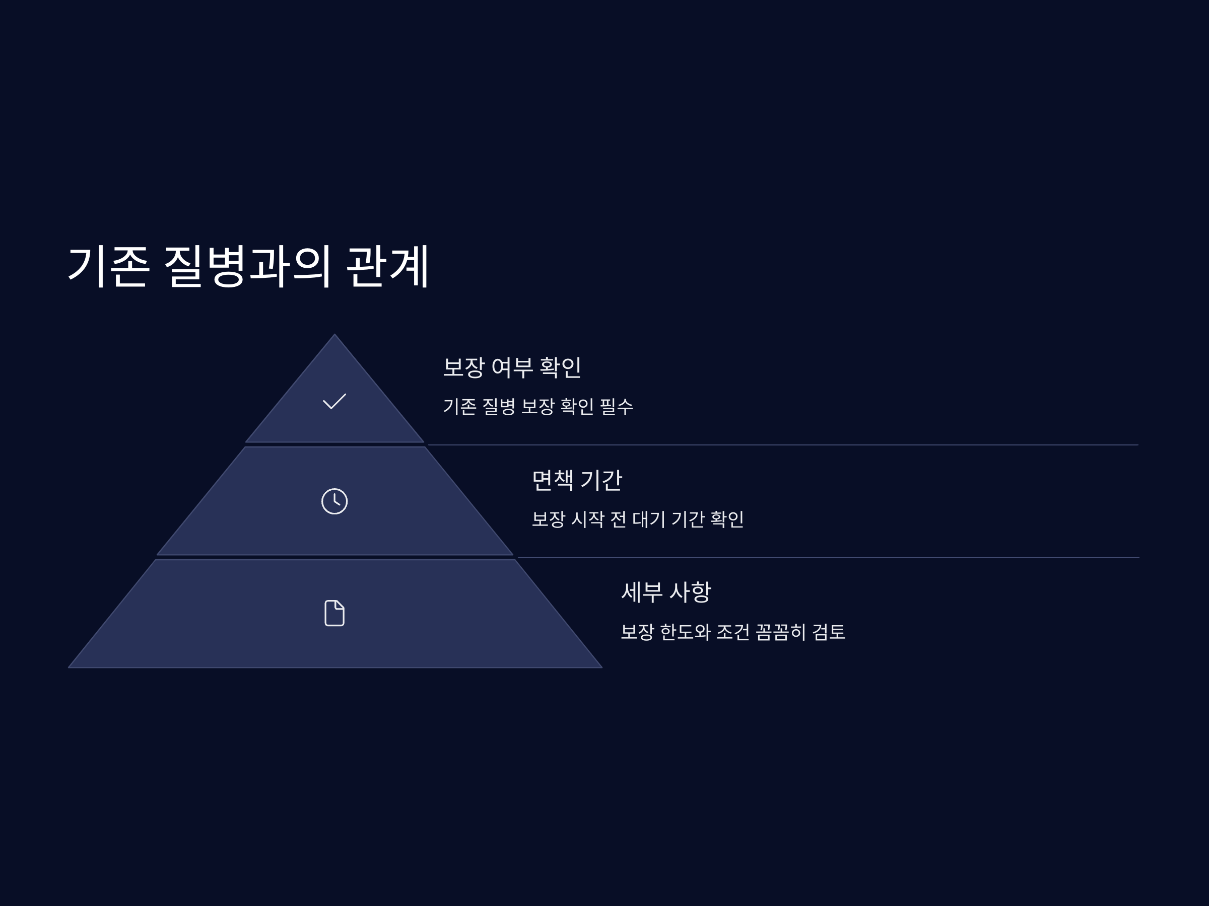 고령층은 이전에 이미 앓고 있는 질병이 있을 수 있습니다. 이 경우, 기존 질병에 대한 보장 여부를 확인하는 것이 필수적입니다. 일부 보험 상품은 기존 질병에 대해 보장이 되지 않거나, 보장 한도가 낮을 수 있기 때문에 반드시 세부 사항을 확인해야 합니다. 또한, 가입 시 면책 기간이나 대기 기간 등을 정확히 알아두는 것이 필요합니다.