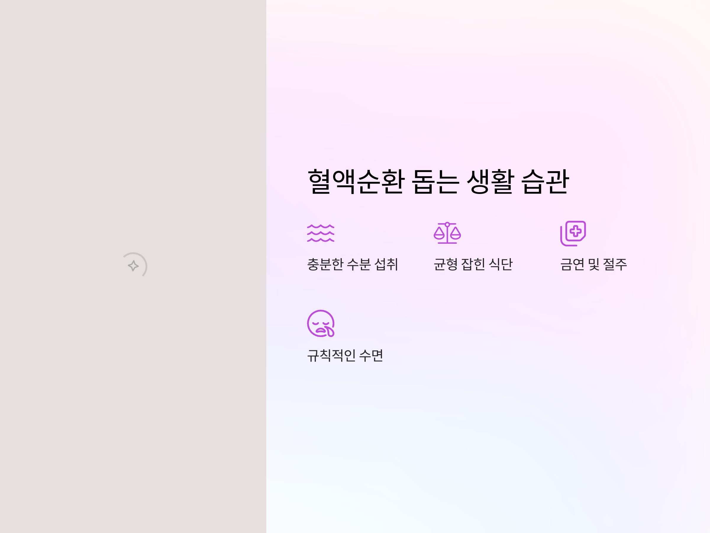 - 충분한 수분 섭취: 하루 1.5~2L의 물을 마셔 혈액이 잘 흐르도록 합니다.