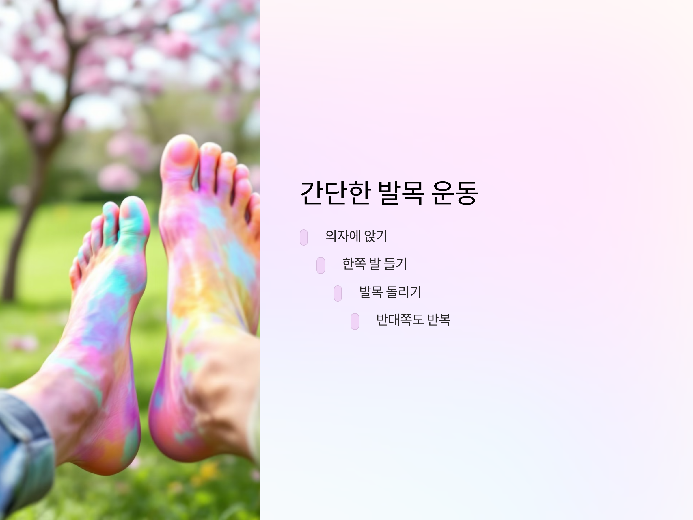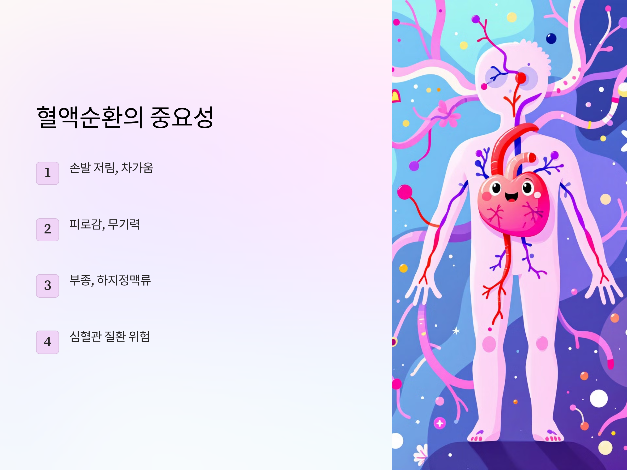 혈액순환이 원활하면 몸이 가볍고 활력이 넘치는 생활을 할 수 있습니다. 오늘부터라도 하루 10분씩 간단한 운동을 실천해 보세요. 꾸준한 노력이 건강한 미래를 만듭니다.