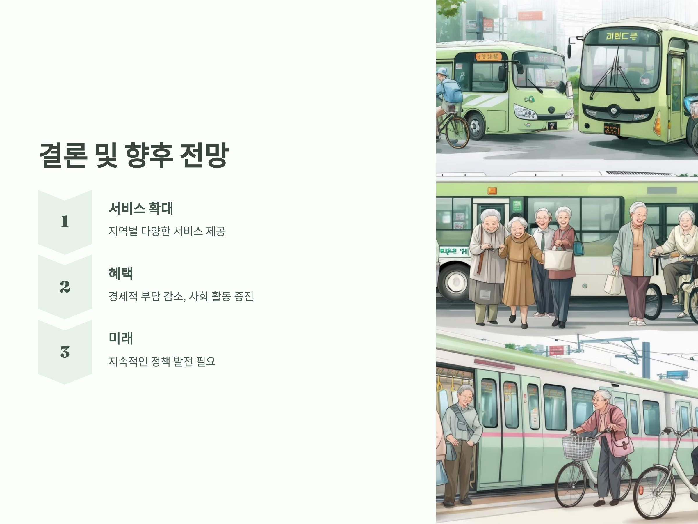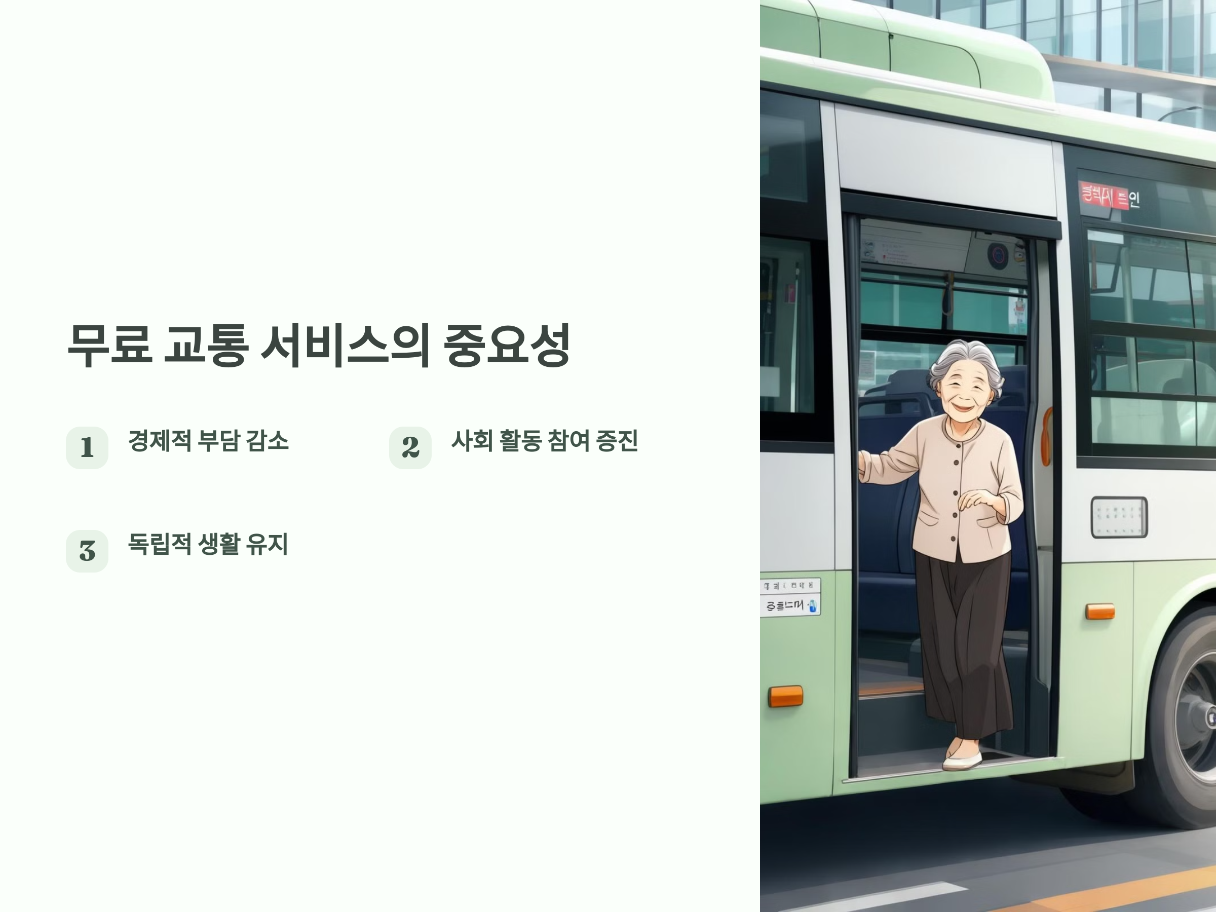 이와 같은 무료 교통 서비스는 교통의 불편을 최소화하고, 고령층의 삶의 질을 향상시키는 데 중요한 역할을 합니다.