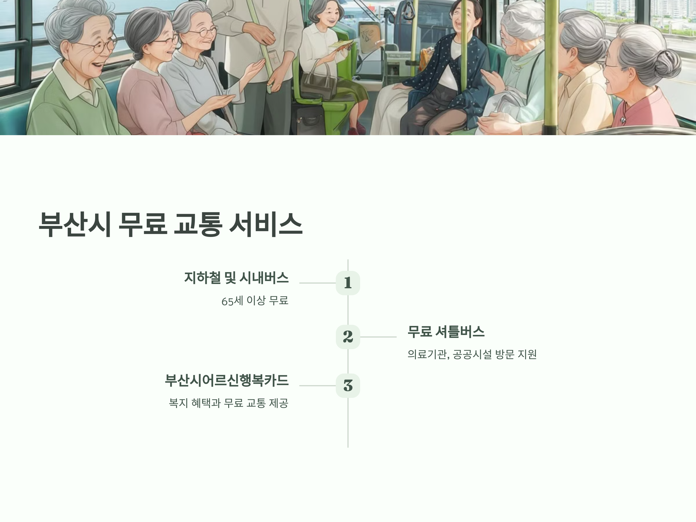 부산시는 또한, "부산시어르신행복카드"를 통해 다양한 복지 혜택과 함께 무료 교통 서비스를 제공하여 고령층의 삶의 질을 향상시키고 있습니다.