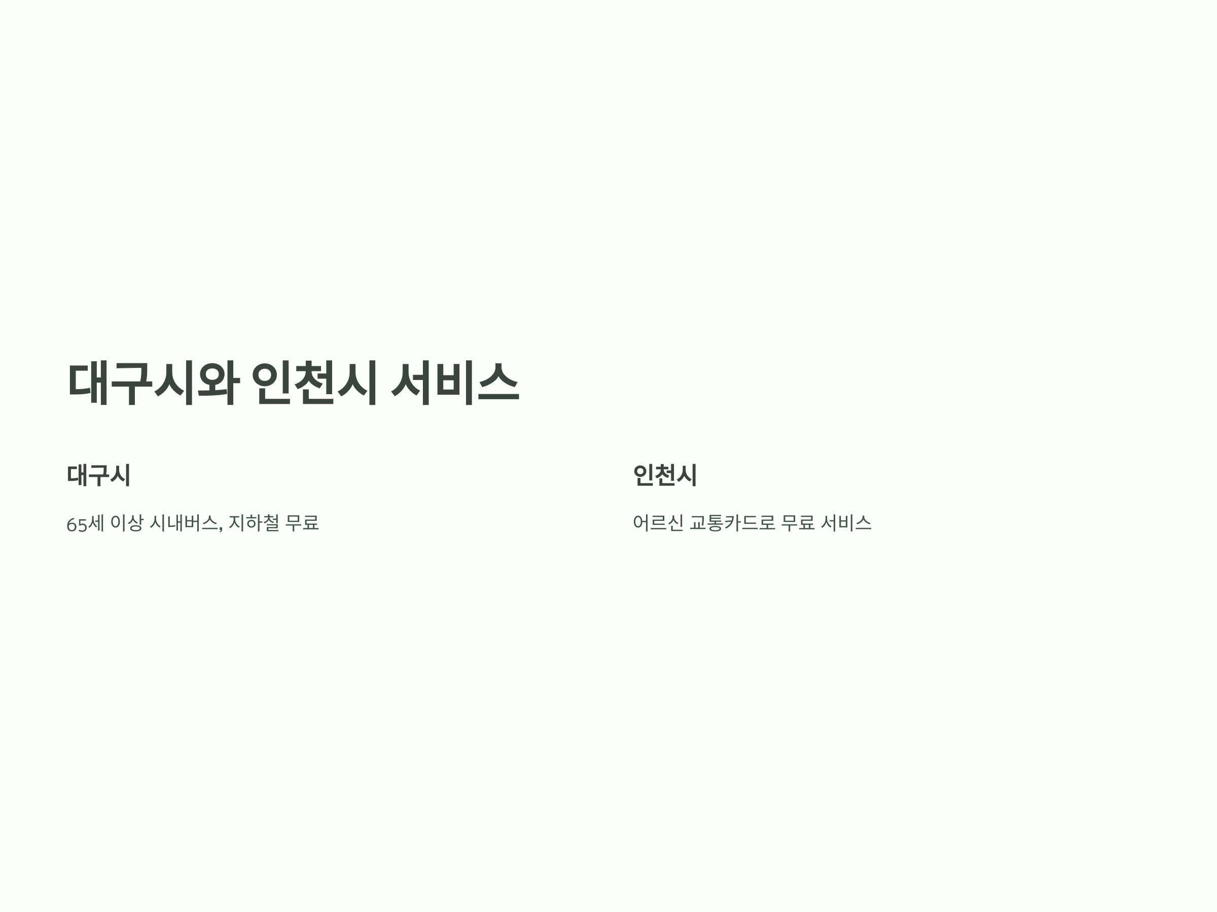 대구와 인천은 고령층을 위한 다양한 무료 교통 서비스를 운영하고 있습니다. 대구시는 65세 이상의 고령층을 대상으로 시내버스와 지하철을 무료로 이용할 수 있는 혜택을 제공하고 있으며, 인천시는 "인천시 어르신 교통카드"를 통해 무료 교통 서비스를 지원합니다.
