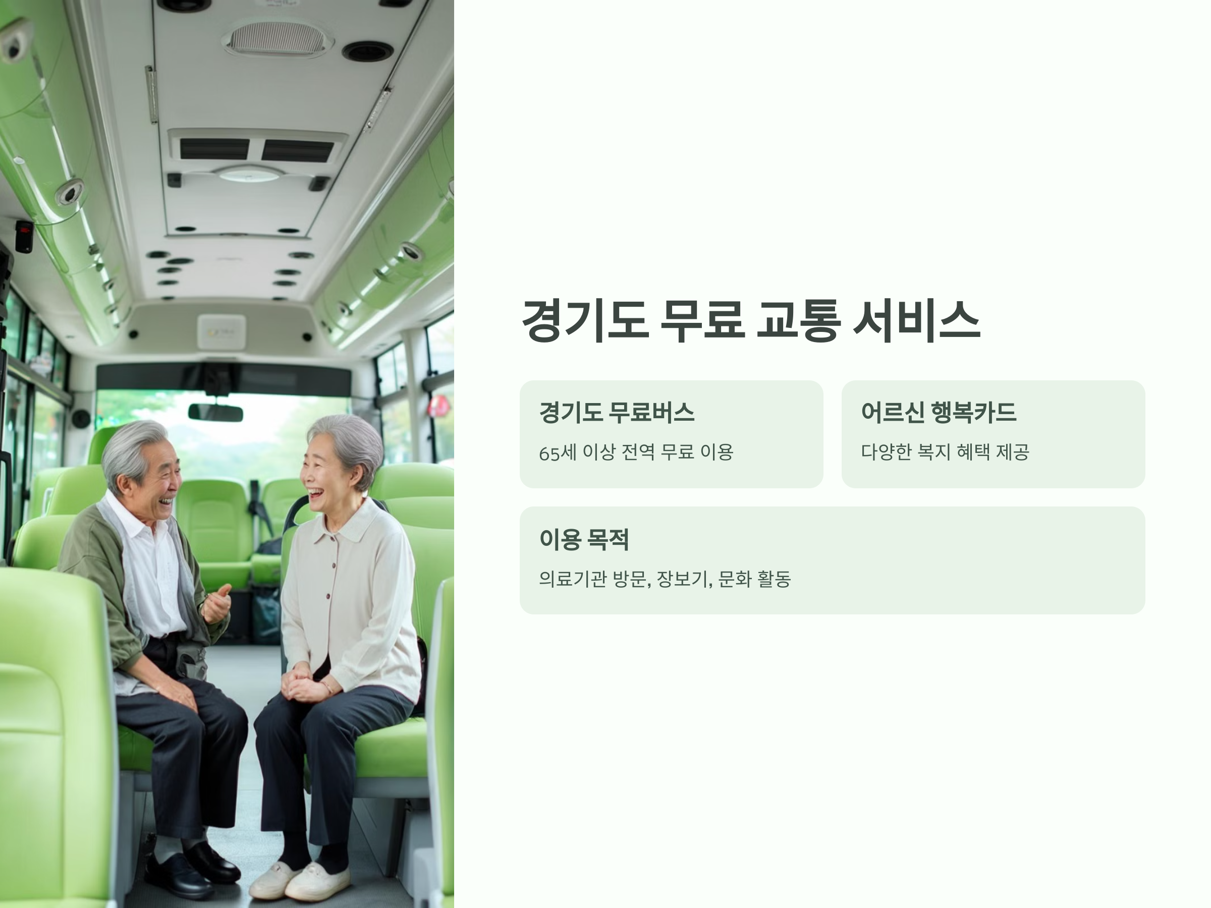 또한, 경기도의 "어르신 행복카드"는 무료 교통을 비롯한 다양한 복지 혜택을 제공하는 카드로, 다양한 이동 편의성을 제공합니다. 이 카드를 이용하면 무료 버스를 비롯한 다양한 지역 내 교통 서비스를 손쉽게 이용할 수 있어 매우 유용합니다.