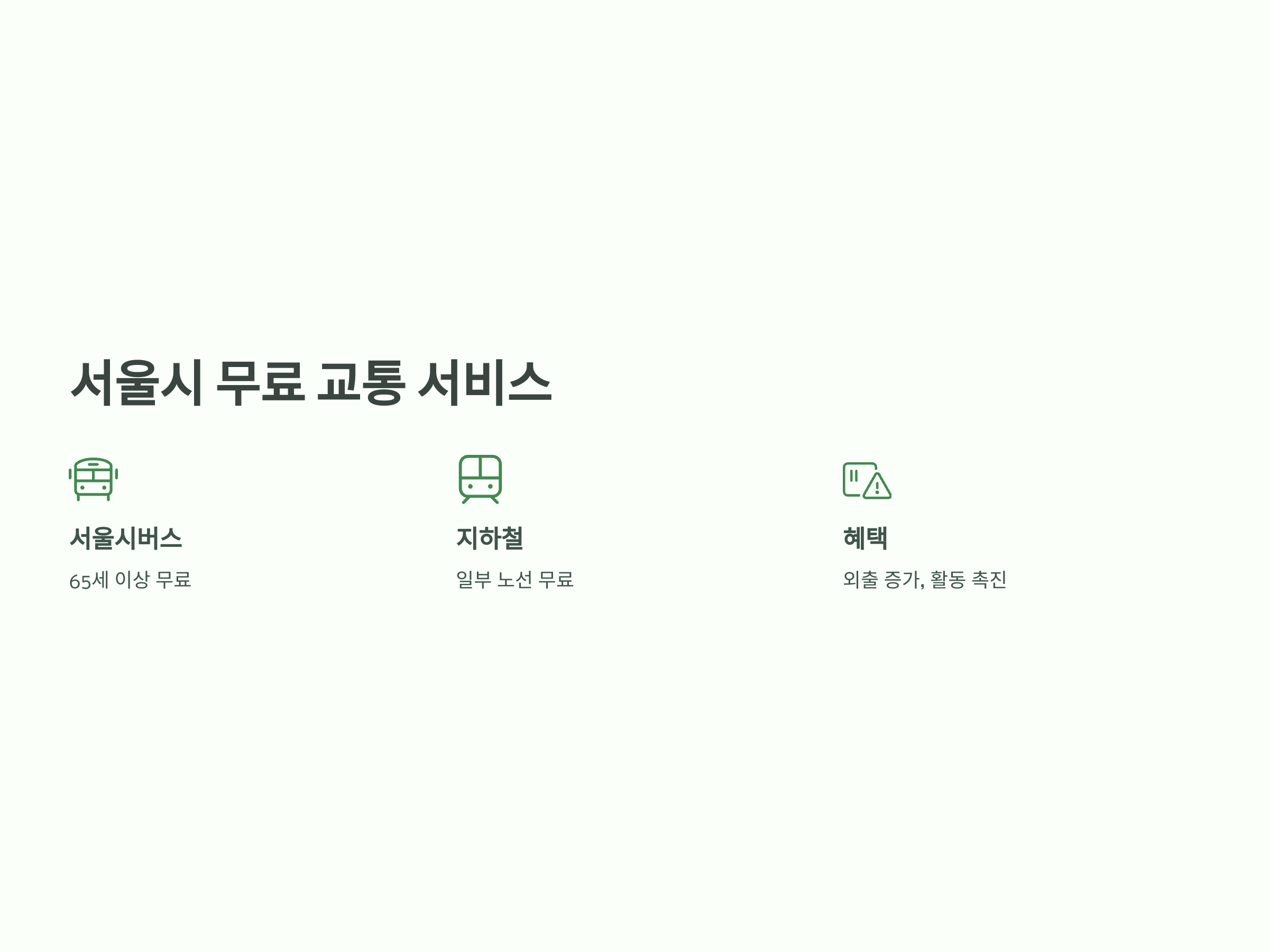 서울시 내에서 무료로 제공되는 교통 서비스는 시민들이 더 많은 외출을 하도록 유도하며, 외부 활동을 활발히 할 수 있게 돕습니다. 이를 통해 노인들이 건강하게 사회 활동에 참여할 수 있도록 하는 긍정적인 효과를 보고 있습니다.