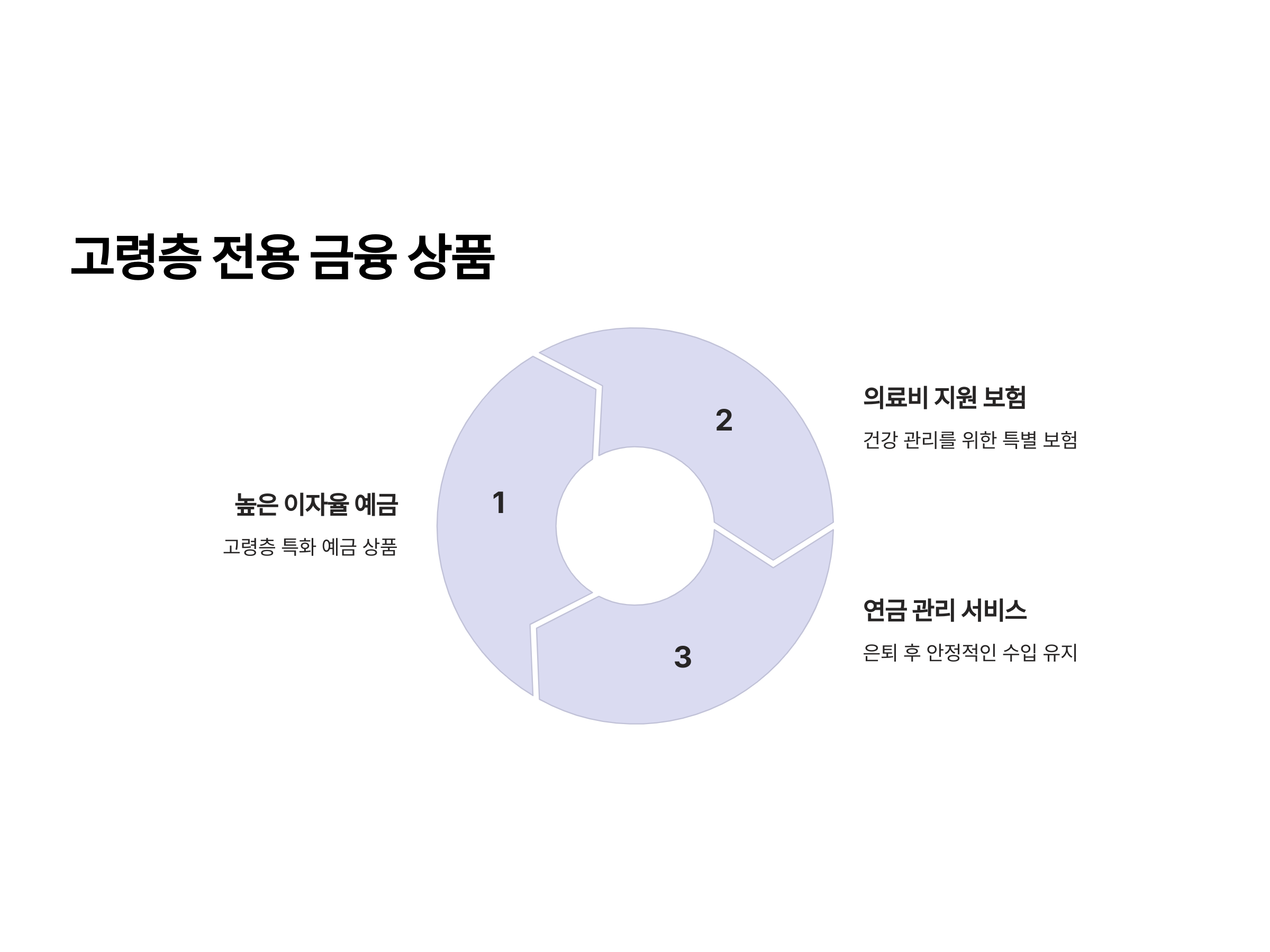 많은 은행들이 고령층을 위한 특화된 금융 상품을 제공합니다. 이러한 금융 상품들은 고령층의 라이프 스타일을 고려하여 설계되었으며, 예를 들어 더 높은 이자율을 제공하는 예금 상품이나, 의료비, 요양비 등을 지원하는 특별 보험 상품 등이 있습니다.