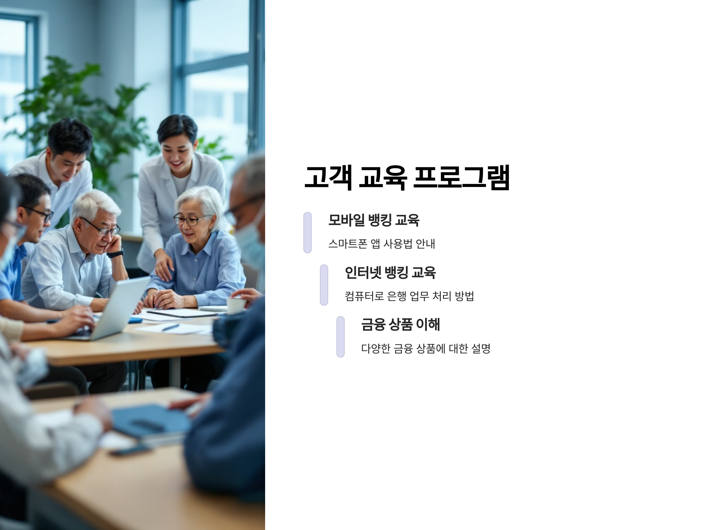 고령층이 은행 서비스의 변화를 따라잡기 어렵다는 점을 감안하여, 많은 은행들이 고객 교육 프로그램을 운영하고 있습니다. 이 프로그램은 모바일 뱅킹, 인터넷 뱅킹 사용법부터 시작해, 다양한 금융 상품에 대한 이해를 돕는 내용까지 포함되어 있습니다. 직접 방문하거나 온라인으로 교육을 받을 수 있어 고령층 고객이 새로운 기술이나 서비스를 배우는 데 큰 도움이 됩니다.