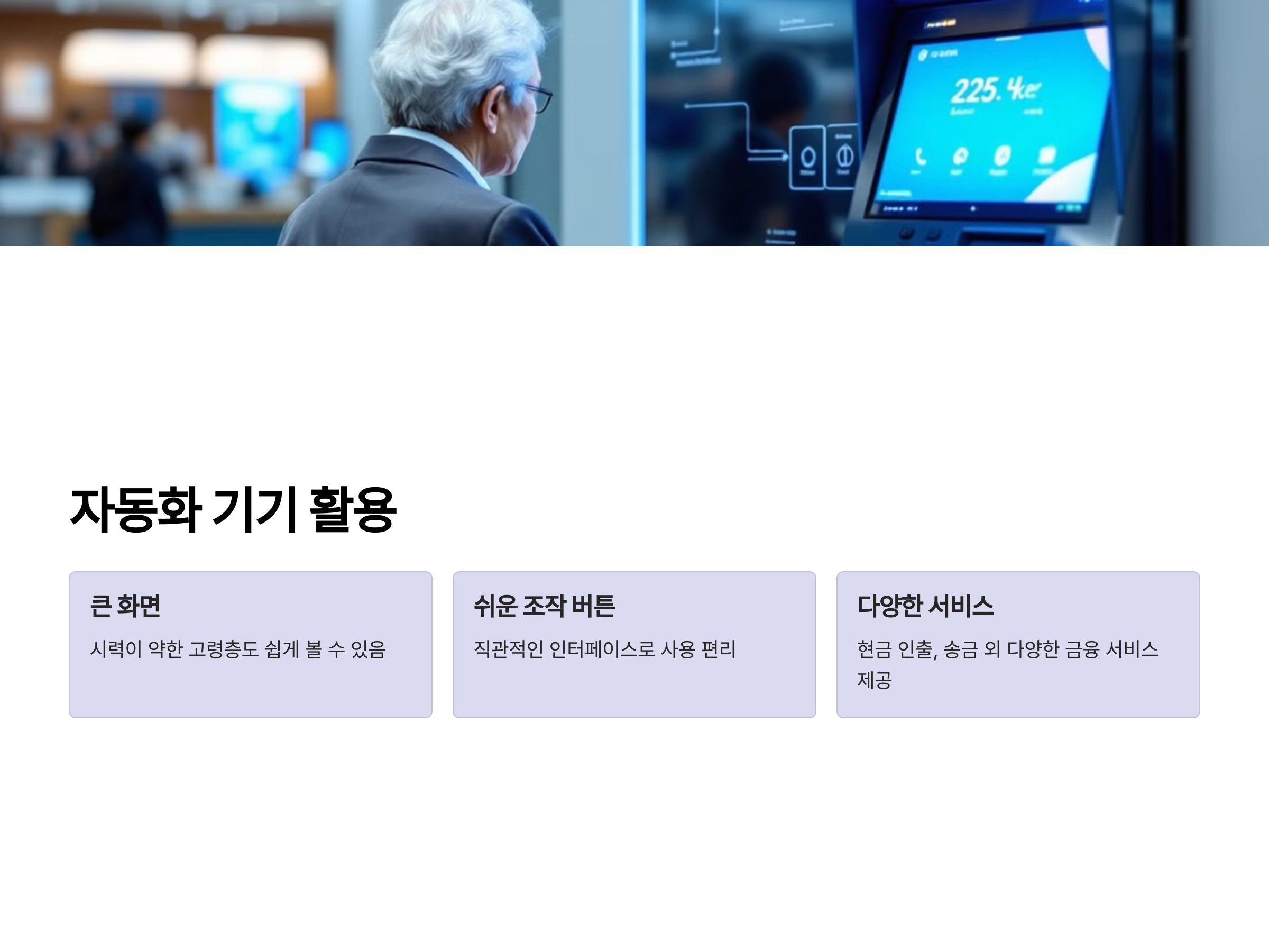 또한, 기존의 현금 인출, 송금 서비스 외에도, 자동화 기기에서는 다양한 금융 서비스를 제공하는 경우가 많습니다. 고령층 고객이 은행에 가지 않고도 간편하게 금융 서비스를 이용할 수 있게 된 것입니다.
