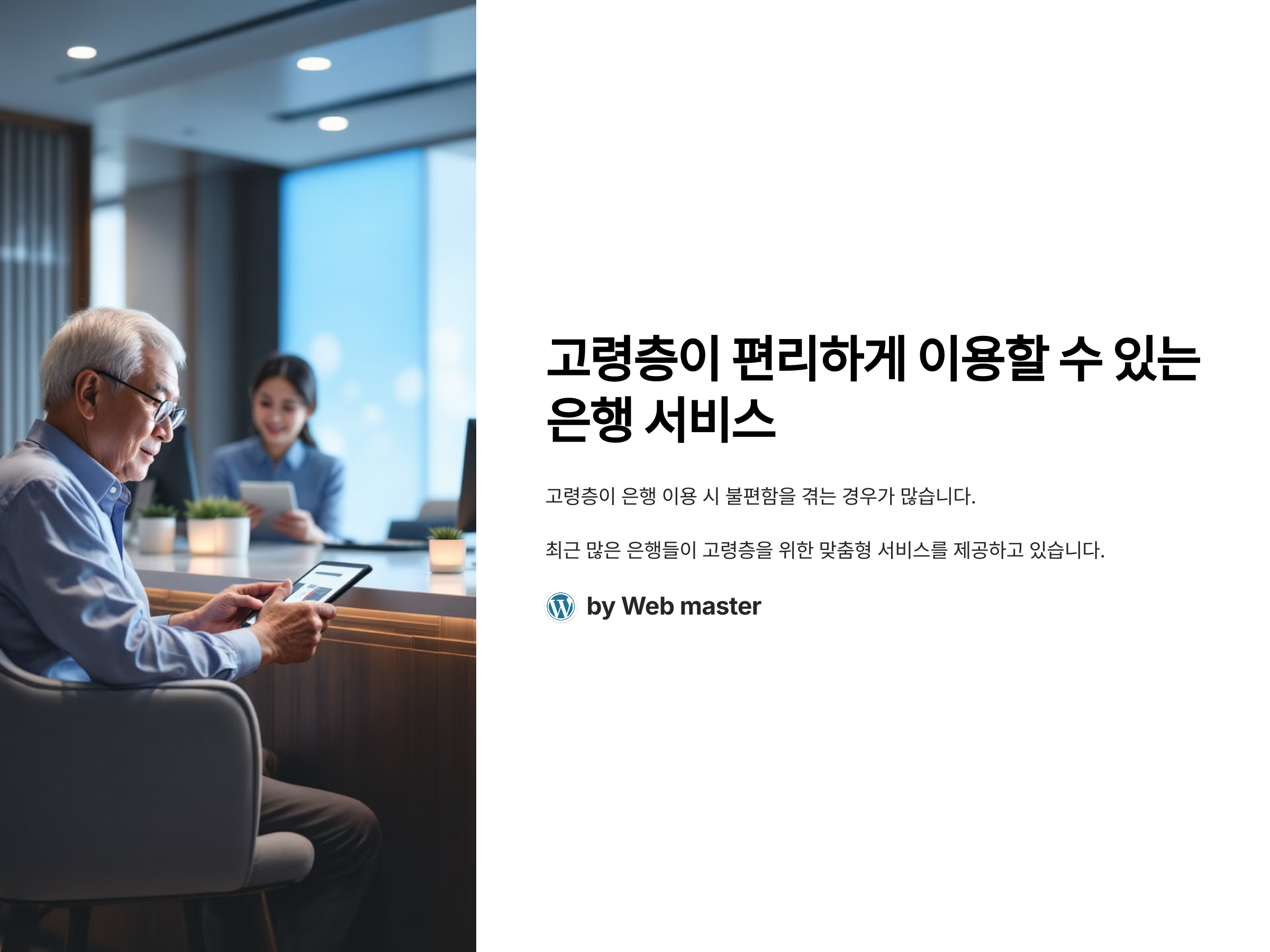 고령층을 위한 은행 서비스는 점차 더 편리해지고 있습니다. 디지털 뱅킹, 맞춤형 상담 서비스, 자동화 기기, 고령층 전용 금융 상품 등 다양한 방법으로 고령층 고객들이 더 쉽게 은행 서비스를 이용할 수 있도록 돕고 있습니다. 앞으로도 은행들은 지속적으로 고령층을 위한 서비스 개선을 통해, 이들이 더 나은 금융 환경을 경험할 수 있도록 노력할 것입니다.