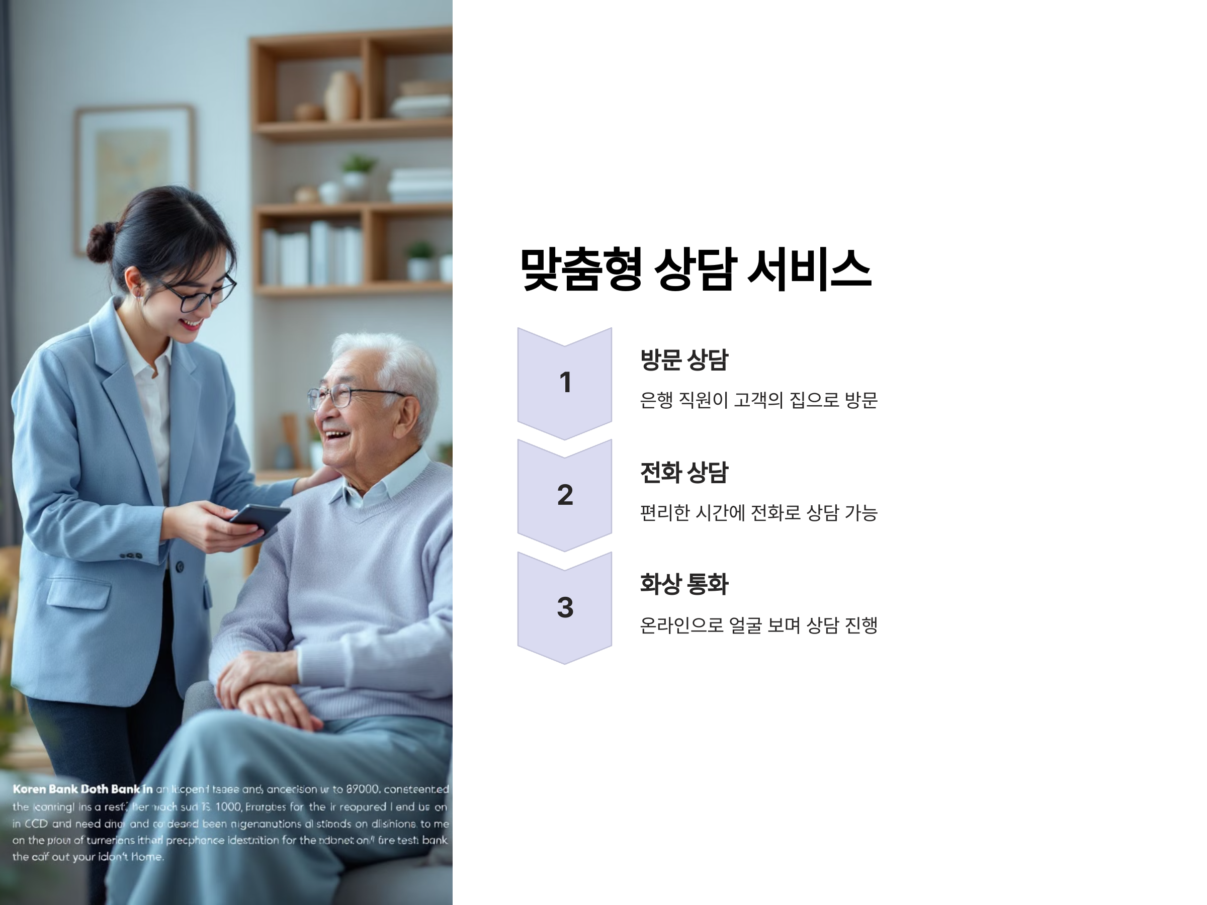 고령층은 은행 업무를 직접 방문하여 상담을 받는 것을 선호하는 경우가 많습니다. 이를 고려한 은행들은 최근 "맞춤형 상담 서비스"를 제공하고 있습니다. 은행 직원이 직접 고객의 집이나 편리한 장소로 찾아가는 서비스부터, 전화나 화상 통화를 통해 온라인 상담을 진행하는 서비스까지 다양한 방법으로 고령층 고객의 접근성을 높이고 있습니다.
