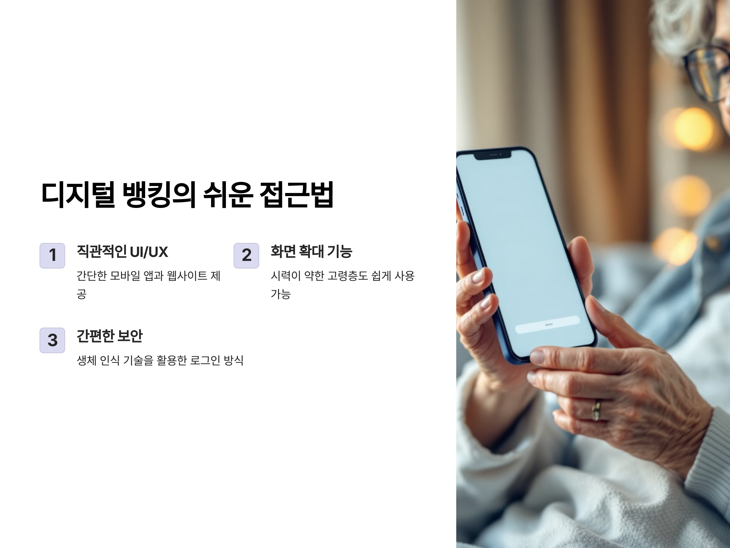 디지털 뱅킹은 편리하지만 고령층에게는 다소 어렵게 느껴질 수 있습니다. 하지만 이제 많은 은행들이 고령층 고객을 위해 간단한 모바일 앱과 웹사이트를 제공하고 있습니다. 이러한 앱들은 직관적인 UI/UX를 통해 노년층도 쉽게 접근할 수 있게 디자인되었습니다. 예를 들어, 화면을 확대하거나, 음성 안내 기능을 추가하는 등의 기능은 큰 도움이 될 수 있습니다.