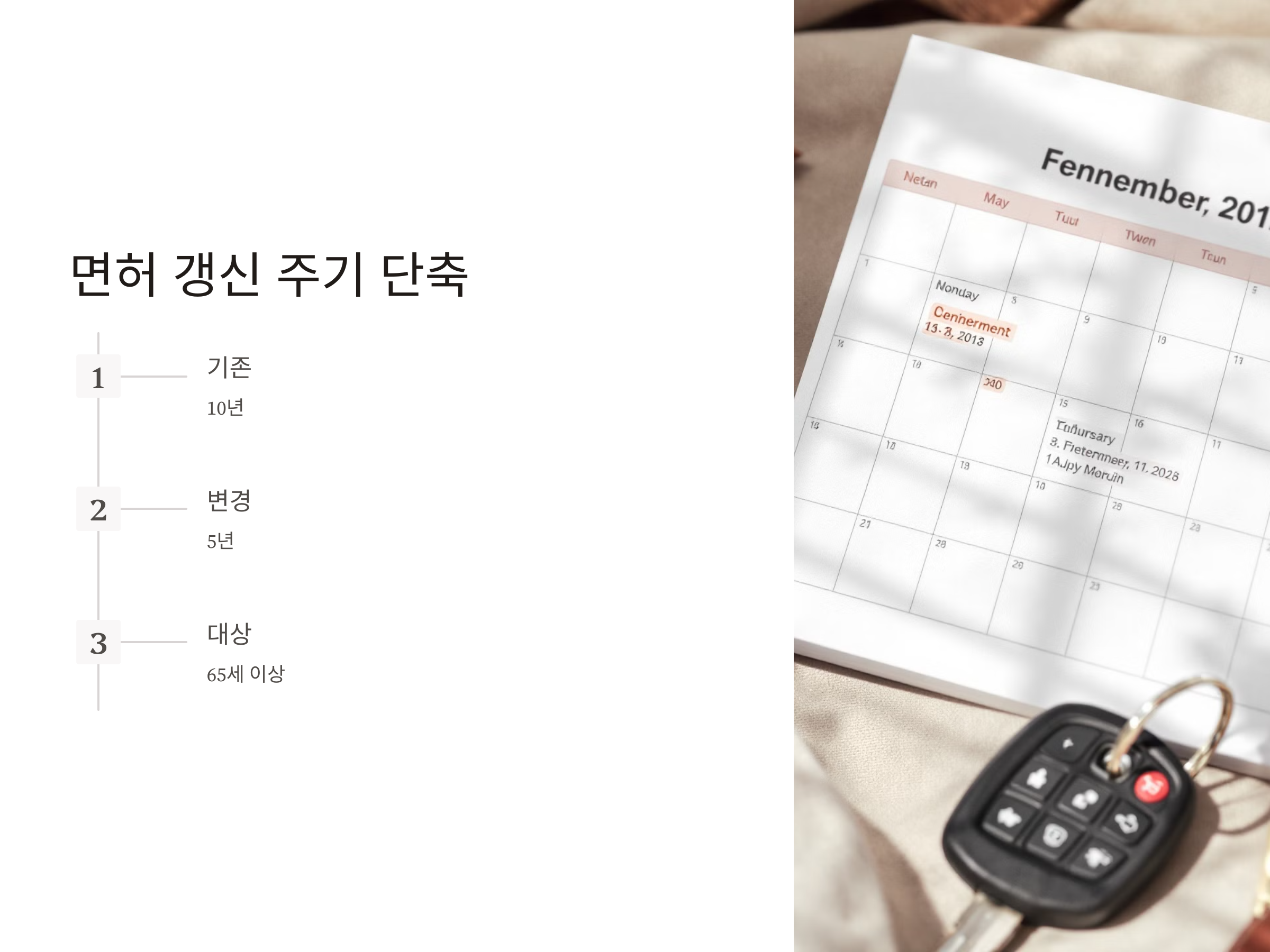 2025년부터 65세 이상 운전자의 면허 갱신 주기가 기존 10년에서 5년으로 단축되었습니다. 이는 고령 운전자의 신체적 변화를 고려하여 안전한 운전을 보장하기 위한 조치입니다. 따라서 65세 이상 운전자는 새로운 갱신 주기를 확인하고, 갱신 시 필요한 절차를 미리 준비해야 합니다. 갱신 시기와 절차를 놓치지 않도록 주의하시기 바랍니다.