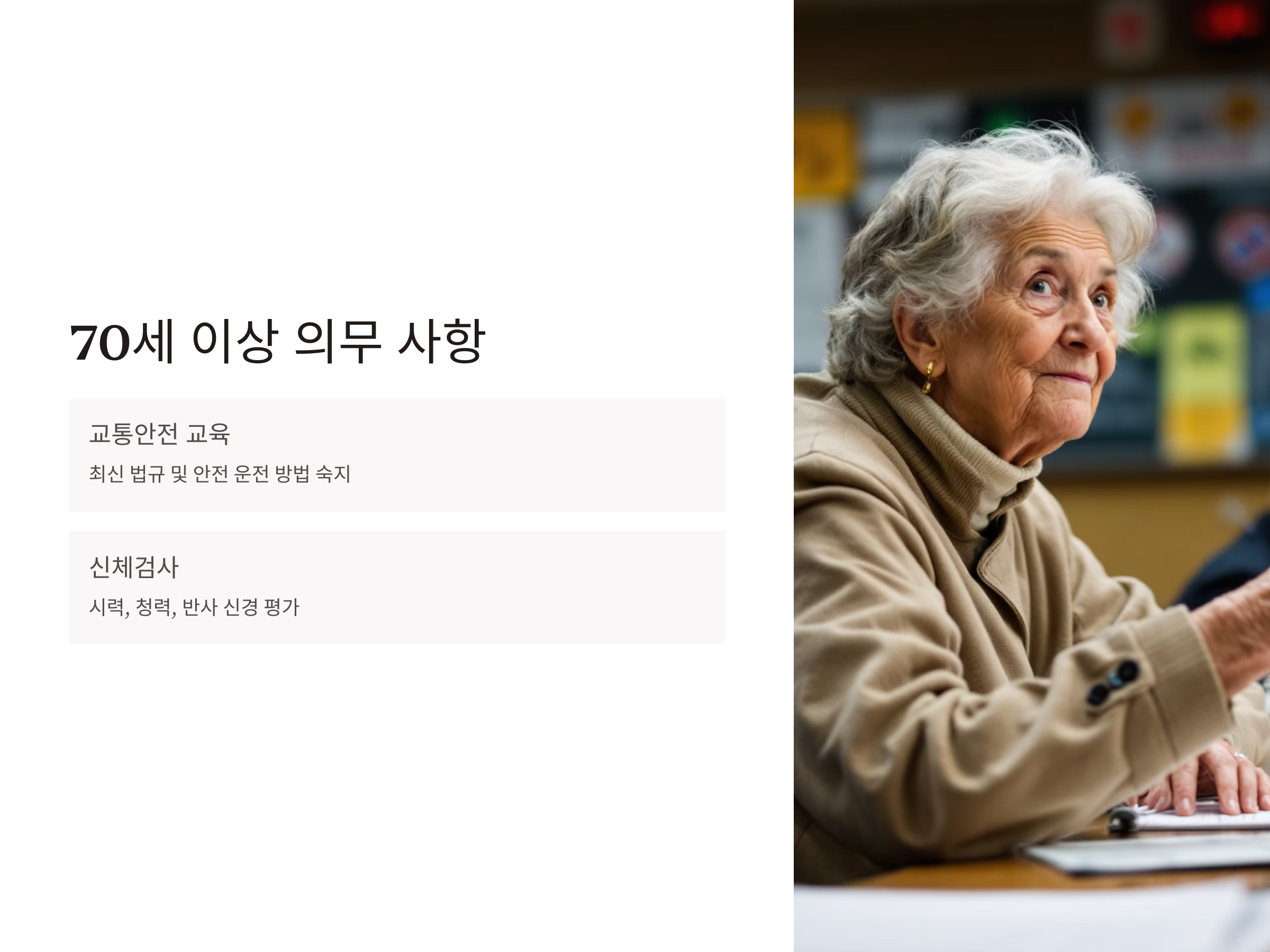 70세 이상 운전자는 면허 갱신 시 교통안전 교육과 신체검사를 반드시 이수해야 합니다. 교통안전 교육은 최신 교통법규와 안전 운전 방법을 숙지하는 데 도움이 되며, 신체검사는 시력, 청력, 반사 신경 등 운전에 필수적인 신체 능력을 평가합니다. 이를 통해 본인의 운전 능력을 객관적으로 파악하고, 필요한 경우 운전 습관을 개선할 수 있습니다.