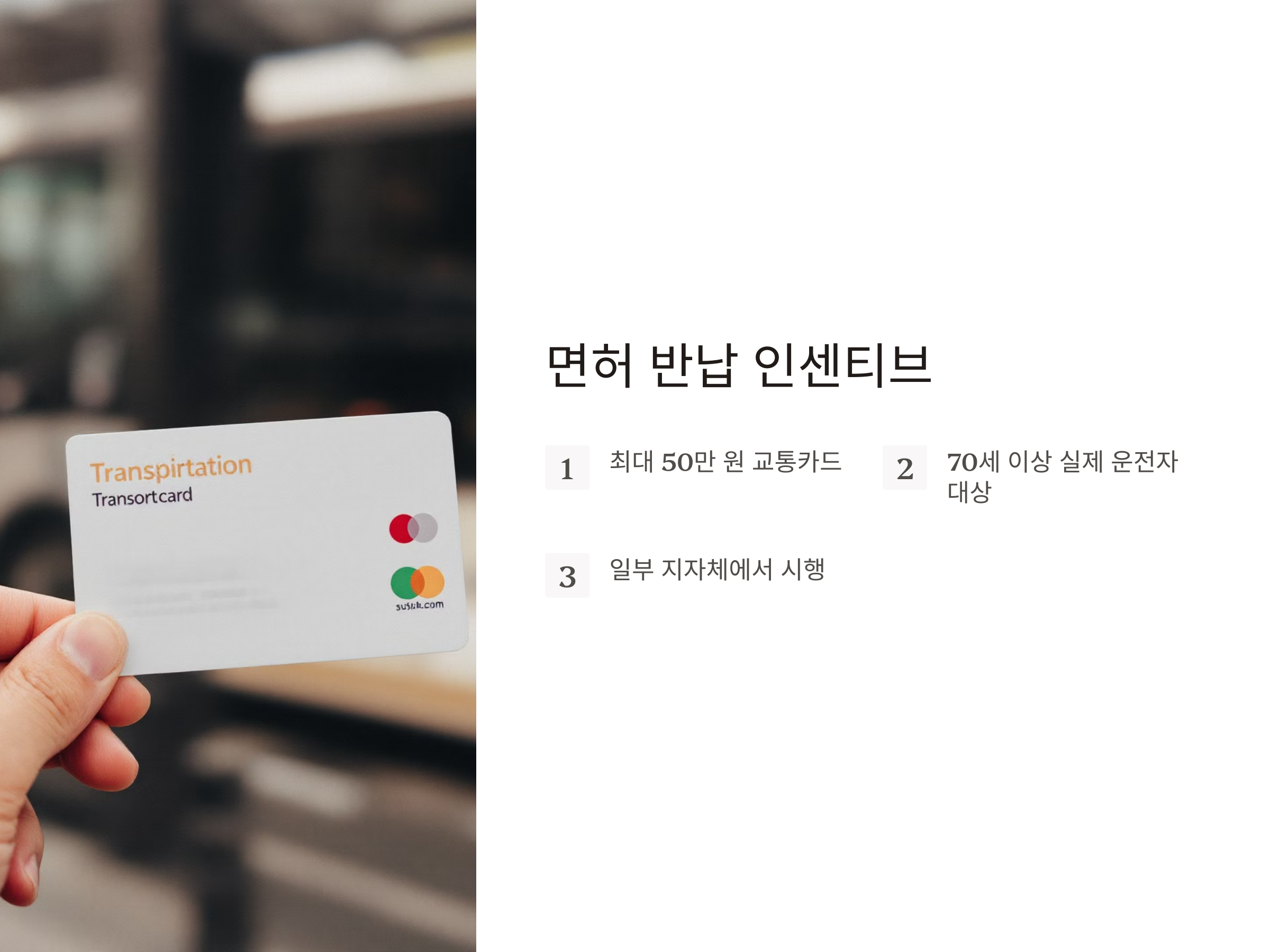 일부 지자체에서는 고령 운전자의 자발적인 면허 반납을 장려하기 위해 인센티브를 제공하고 있습니다. 예를 들어, 강남구는 70세 이상 실제 운전자가 면허를 반납하면 최대 50만 원이 충전된 교통카드를 지급합니다. 이러한 제도는 고령 운전자의 안전을 강화하고, 교통사고를 예방하는 데 큰 도움이 됩니다. 자신의 운전 능력에 자신이 없거나 대중교통 이용이 가능한 경우, 이러한 인센티브를 고려해보시는 것도 좋습니다.