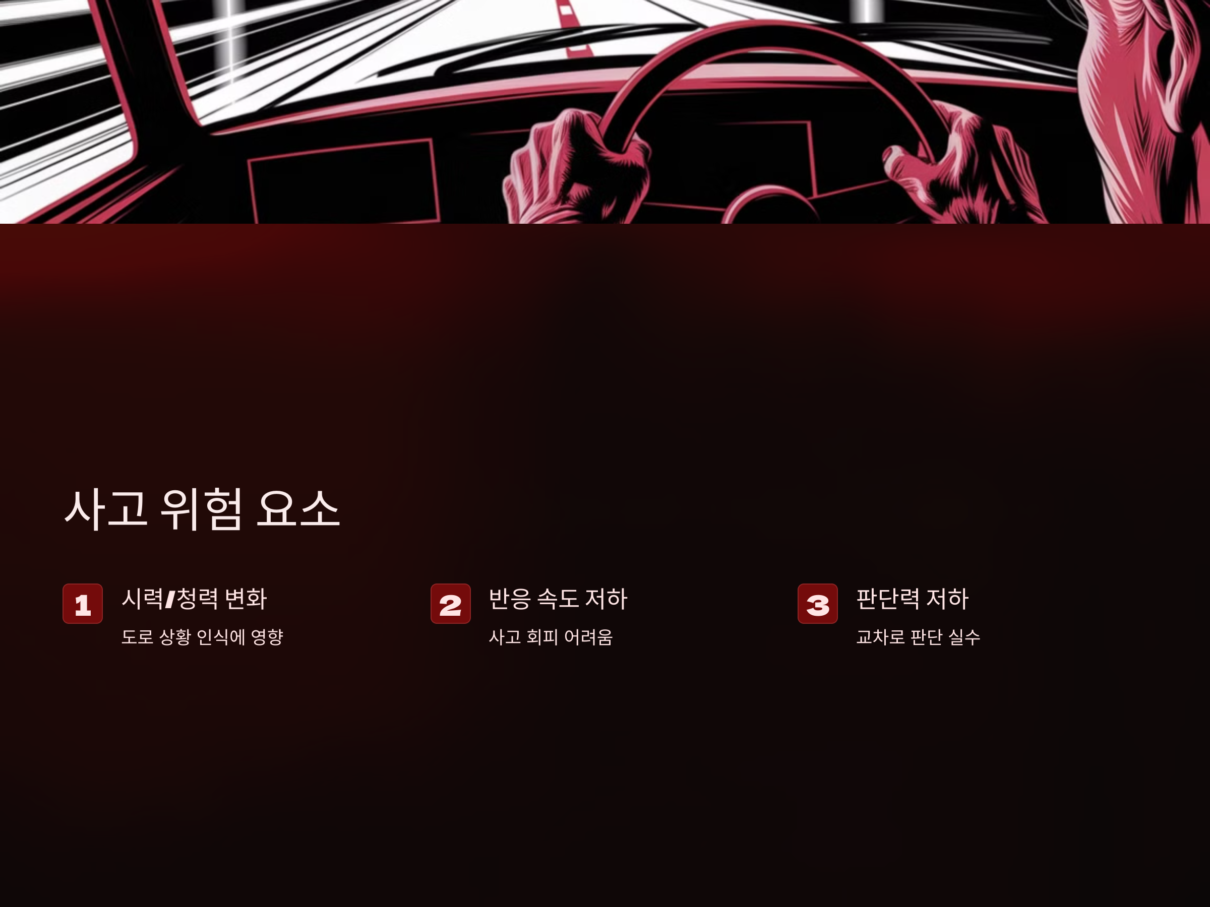 고령 운전자는 시력, 청력, 반응 속도 등의 변화로 인해 운전 시 어려움을 겪을 수 있습니다. 특히, 밤에 운전하거나 도로 상황이 빠르게 변화하는 경우, 사고를 예방하기 어려울 수 있습니다.