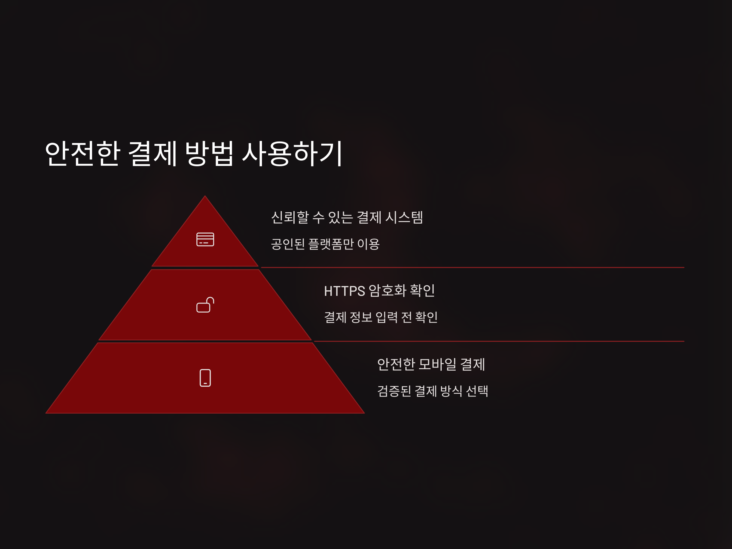 신용카드나 은행 계좌 정보를 입력할 때는 HTTPS 암호화된 웹사이트를 사용하는지 확인하고, 결제 정보를 제공하기 전에 안전한 사이트임을 확실히 확인해야 합니다. 또한, 가상화폐나 모바일 결제 시스템을 사용할 때도 신뢰할 수 있는 방법을 선택하는 것이 좋습니다.