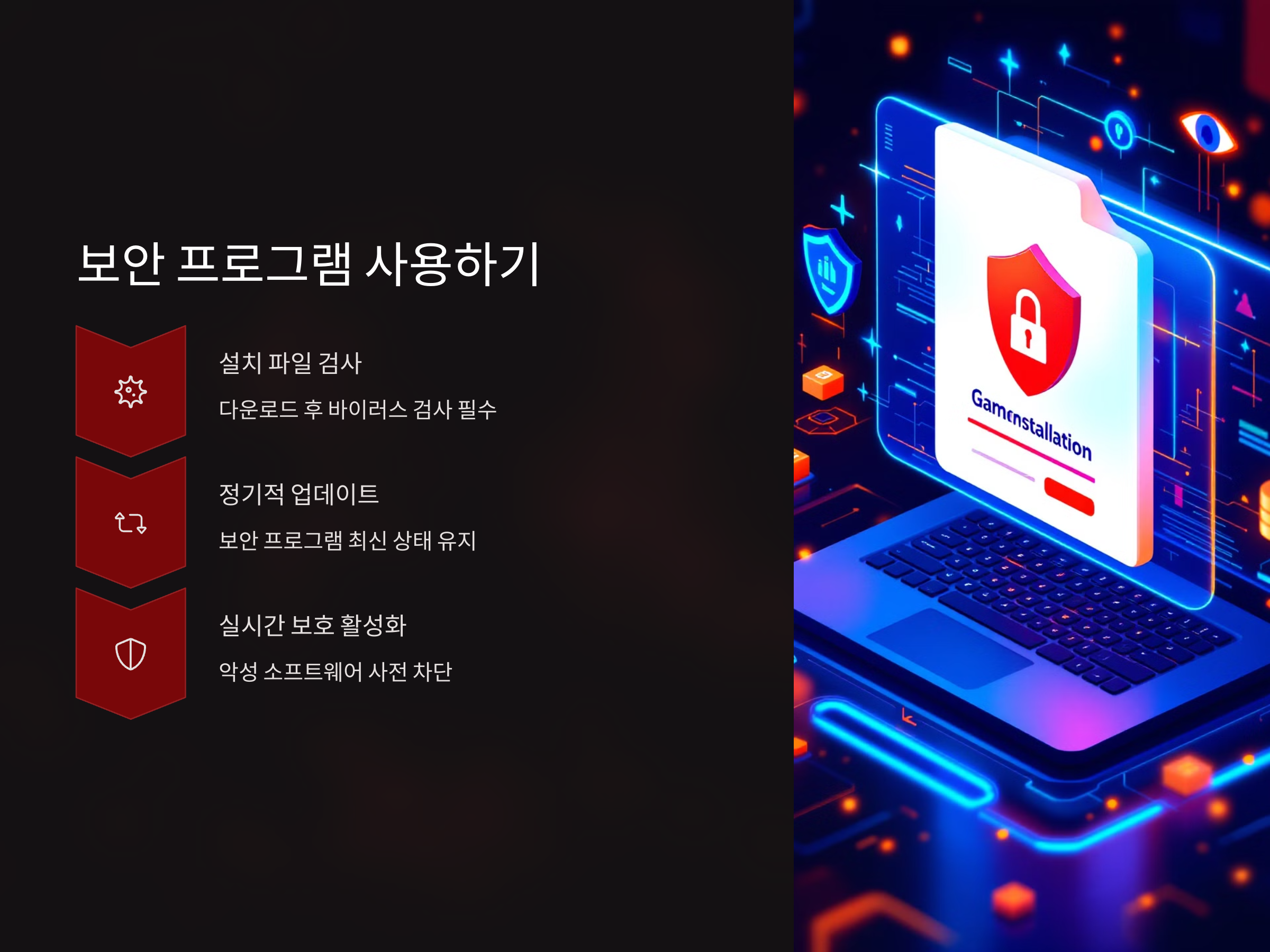 정기적으로 보안 프로그램을 업데이트하고 실시간 보호 기능을 활성화하여, 다운로드한 게임이 바이러스나 트로이 목마와 같은 악성 소프트웨어를 포함하지 않도록 보호해야 합니다. 안티바이러스 프로그램을 사용하면, 이와 같은 위험을 미리 차단할 수 있습니다.