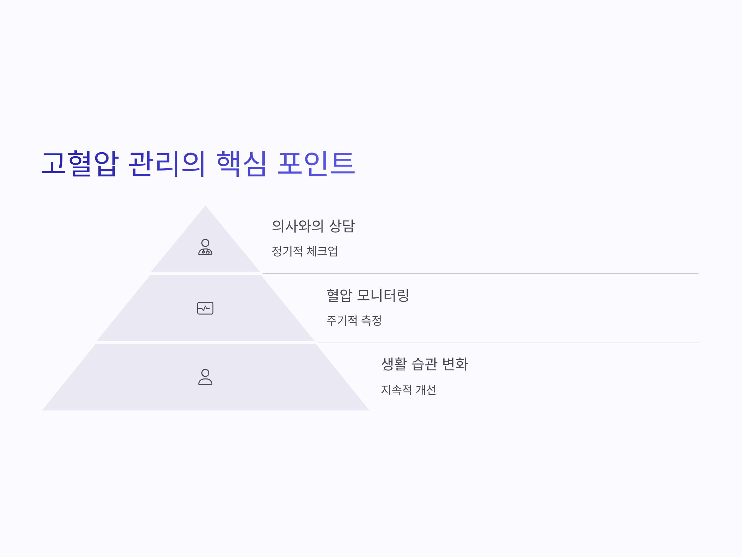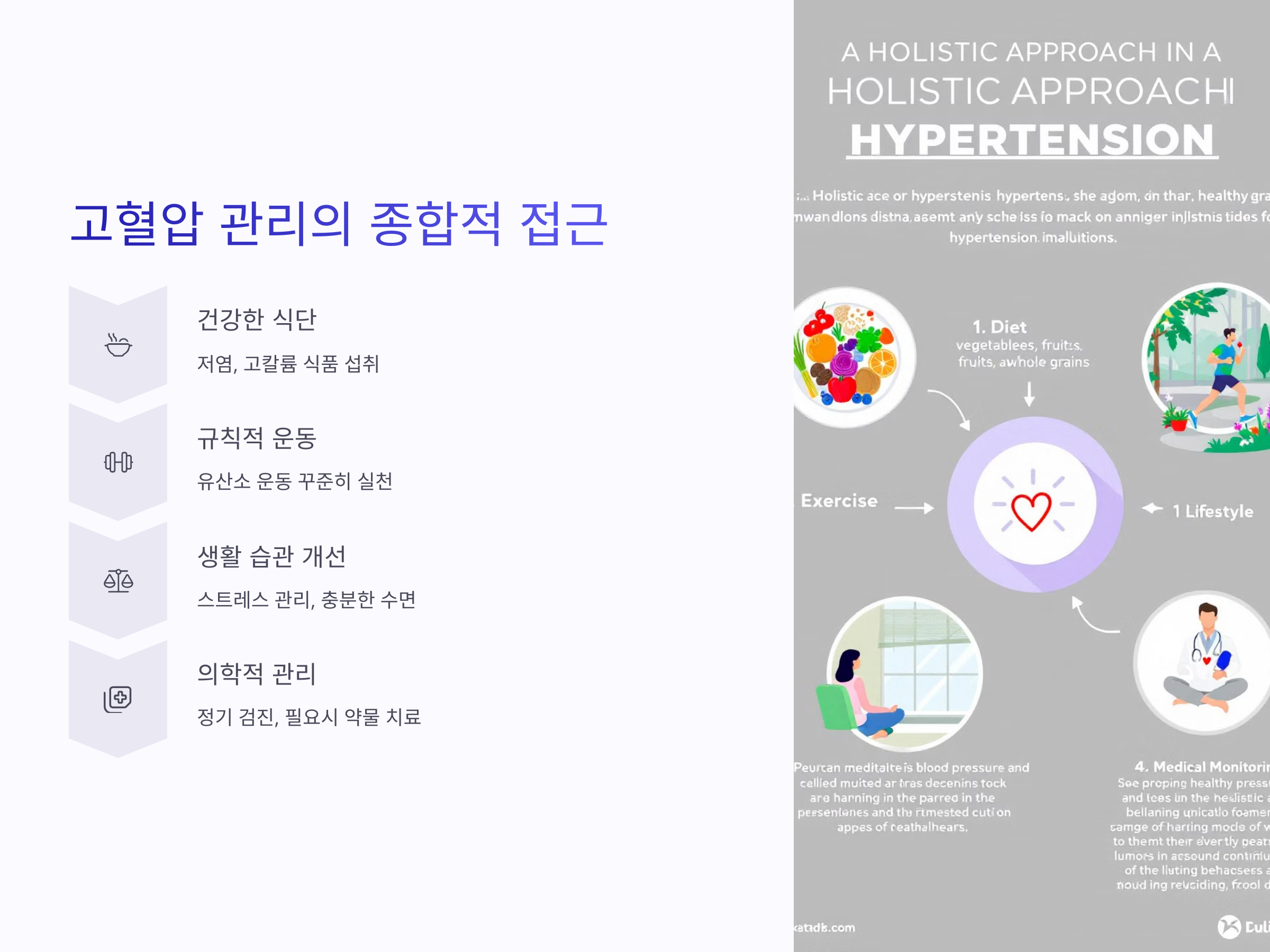 고혈압을 예방하고 관리하려면 식습관과 운동 습관을 지속적으로 개선해야 합니다. 음식을 천천히 먹고, 규칙적으로 운동하며, 스트레스를 관리하는 등의 생활 습관을 유지하는 것이 중요합니다. 꾸준한 노력으로 고혈압을 효과적으로 관리할 수 있습니다.