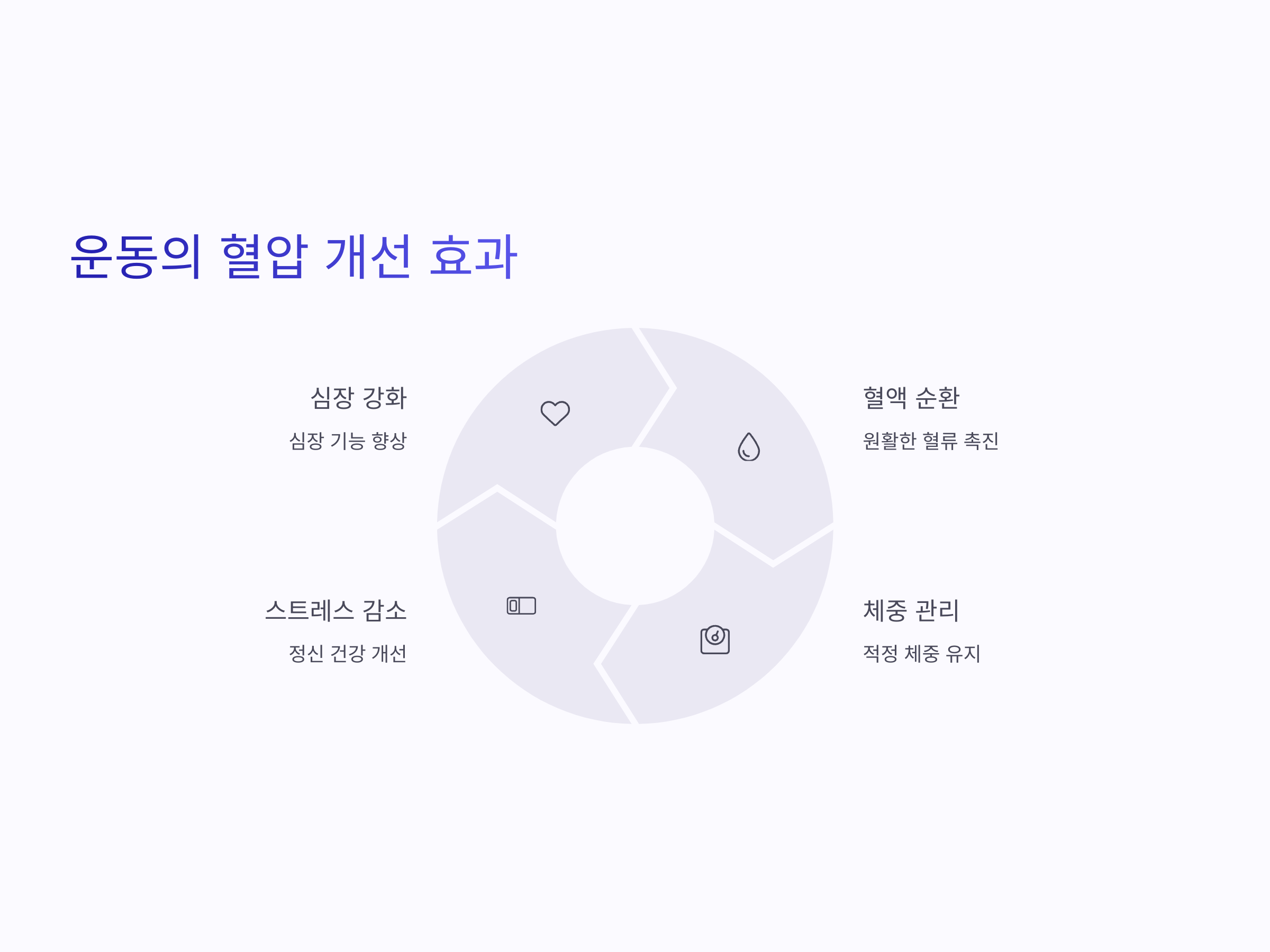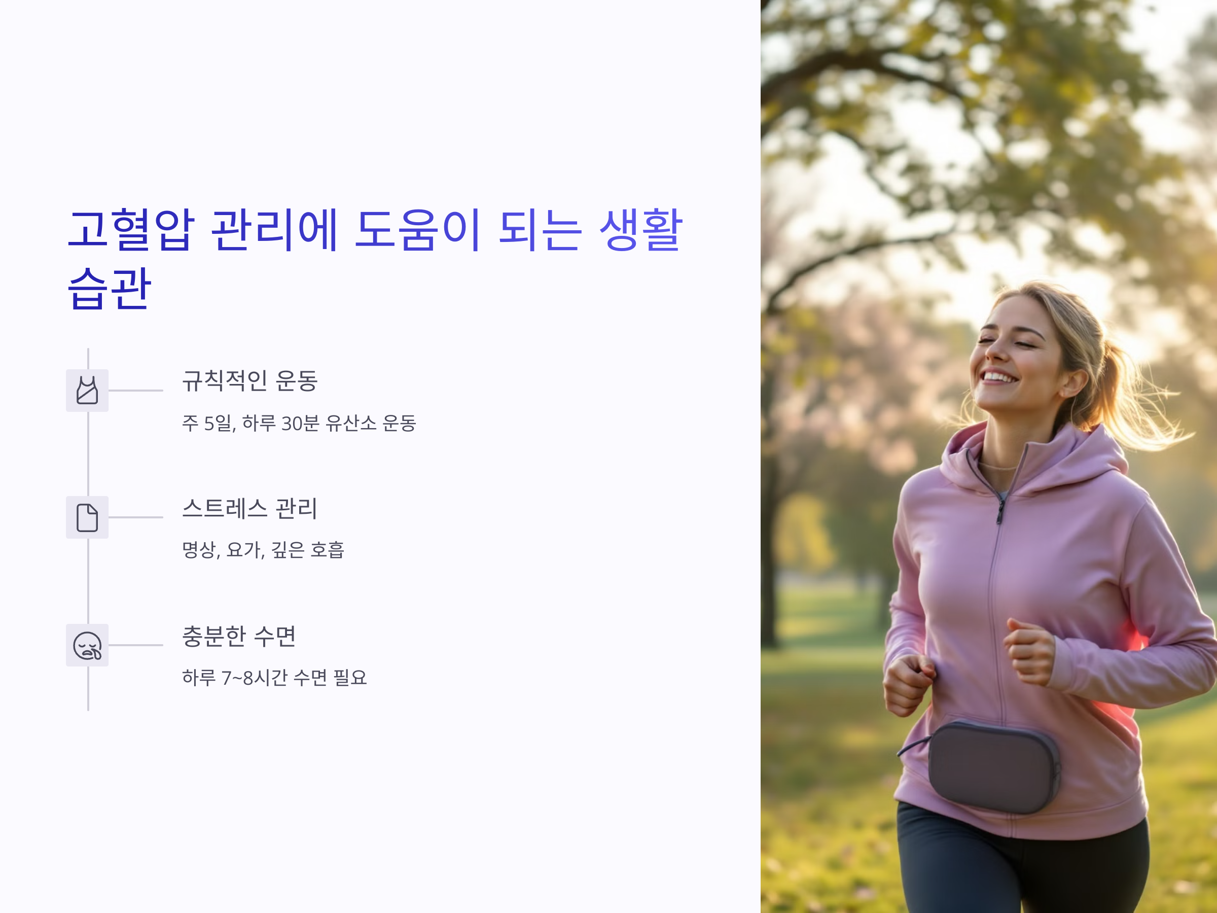 규칙적인 운동은 고혈압을 관리하는 데 중요한 역할을 합니다. 운동은 심장을 강하게 만들고, 혈액 순환을 개선하여 혈압을 낮추는 데 효과적입니다. 주 5일, 하루 30분 정도의 유산소 운동을 꾸준히 하는 것이 좋습니다. 걷기, 자전거 타기, 수영 등 가벼운 유산소 운동을 지속적으로 하면 혈압을 낮추는 데 큰 도움이 됩니다.