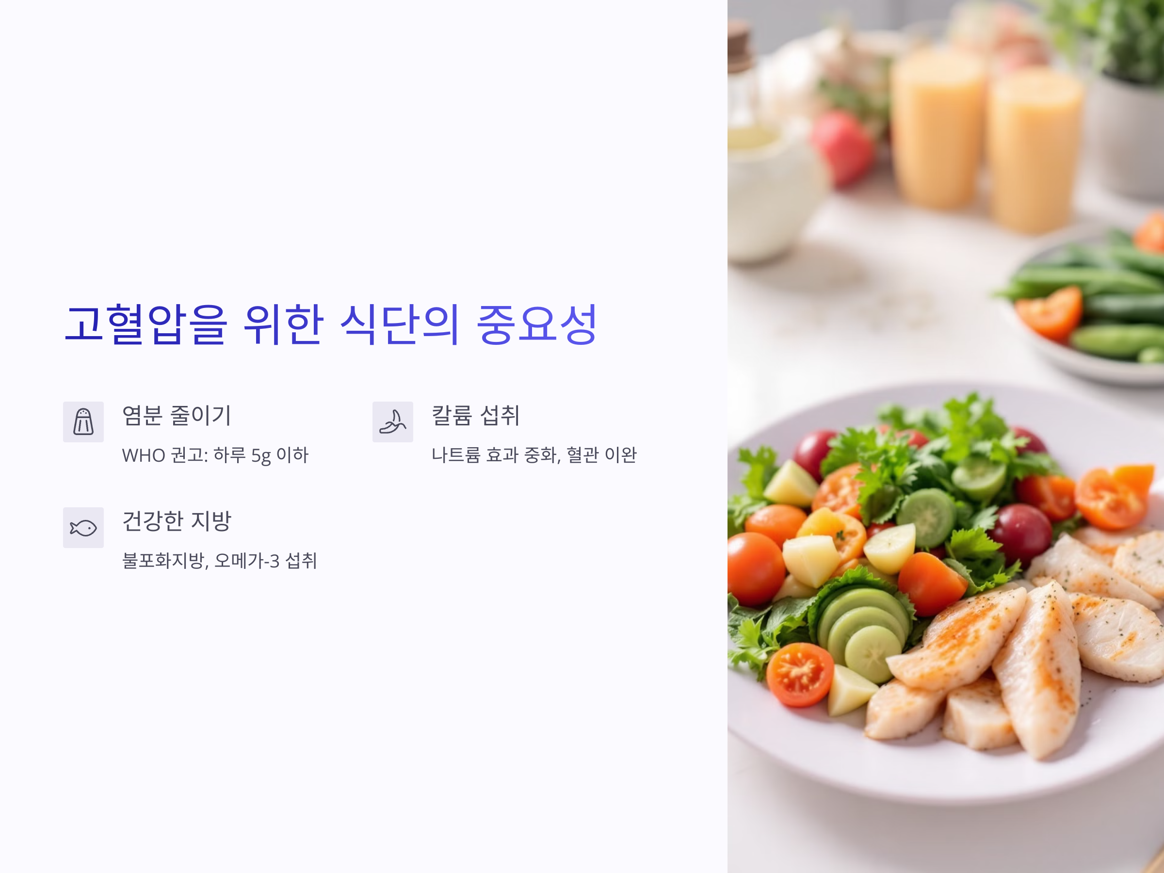 고혈압 관리에 있어 식단은 매우 중요한 역할을 합니다. 과도한 염분 섭취가 고혈압을 유발할 수 있기 때문에, 염분 섭취를 줄이는 것이 첫 번째 과제입니다. 특히 가공식품이나 외식에서 높은 염분을 함유하고 있으므로, 이를 피하는 것이 중요합니다. 고혈압을 예방하고 관리하려면 칼륨, 마그네슘, 섬유소가 풍부한 음식을 섭취하는 것이 좋습니다.