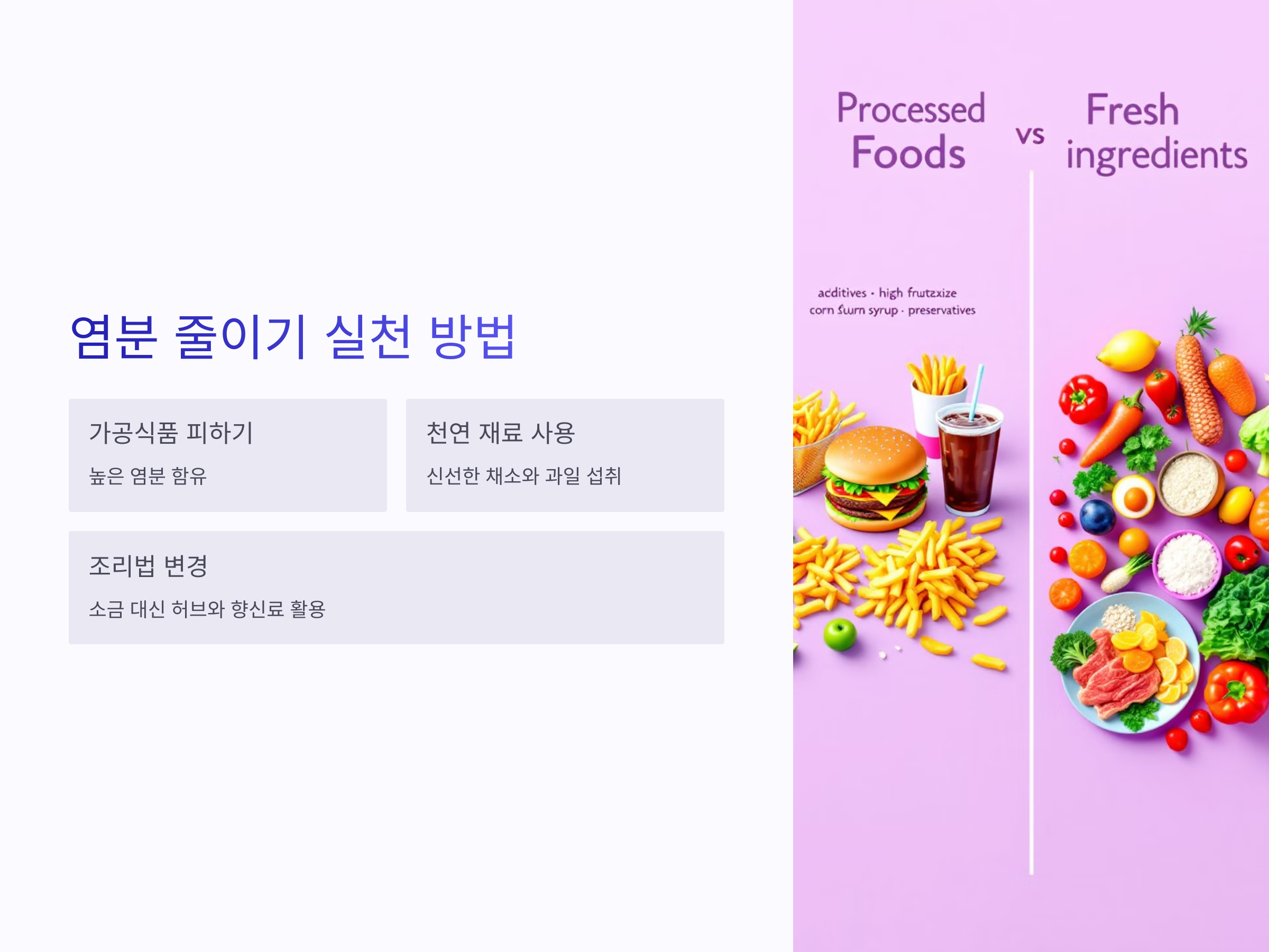 고혈압을 예방하고 관리하는 가장 중요한 식습관 중 하나는 염분 섭취를 줄이는 것입니다. WHO(세계보건기구)는 하루 염분 섭취량을 5g 이하로 제한할 것을 권고하고 있습니다. 염분은 체내에서 나트륨을 증가시켜 혈압을 높일 수 있기 때문에, 소금을 적게 사용하고 가공식품의 섭취를 줄이는 것이 중요합니다. 신선한 채소와 과일을 많이 먹고, 자주 이용하는 음식에는 천연 재료를 사용하는 것이 좋습니다.