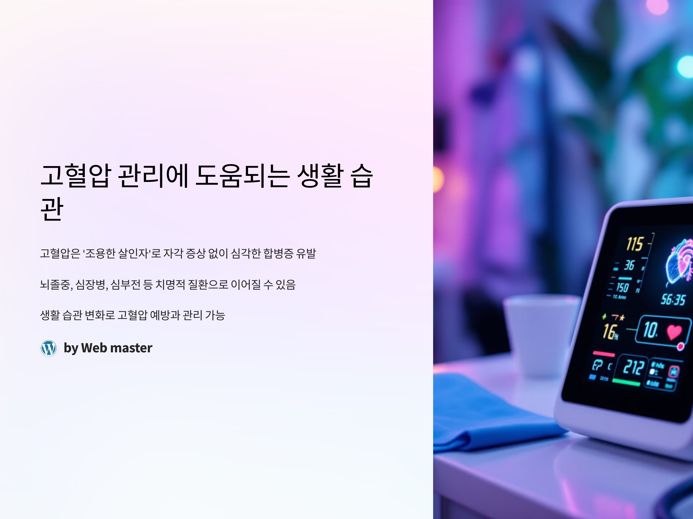 고혈압은 ‘조용한 살인자’라고 불릴 정도로 자각 증상이 없으면서도 방치할 경우 심각한 합병증을 유발할 수 있습니다. 뇌졸중, 심장병, 심부전 등 치명적인 질환으로 이어질 수 있기 때문에, 고혈압 관리가 매우 중요합니다. 고혈압을 예방하고 관리하는 데 중요한 부분은 바로 생활 습관의 변화입니다. 적절한 운동, 균형 잡힌 식단, 스트레스 관리 등을 통해 고혈압을 잘 관리할 수 있습니다. 이 글에서는 고혈압 관리에 도움이 되는 생활 습관에 대해 구체적으로 알아보겠습니다.
