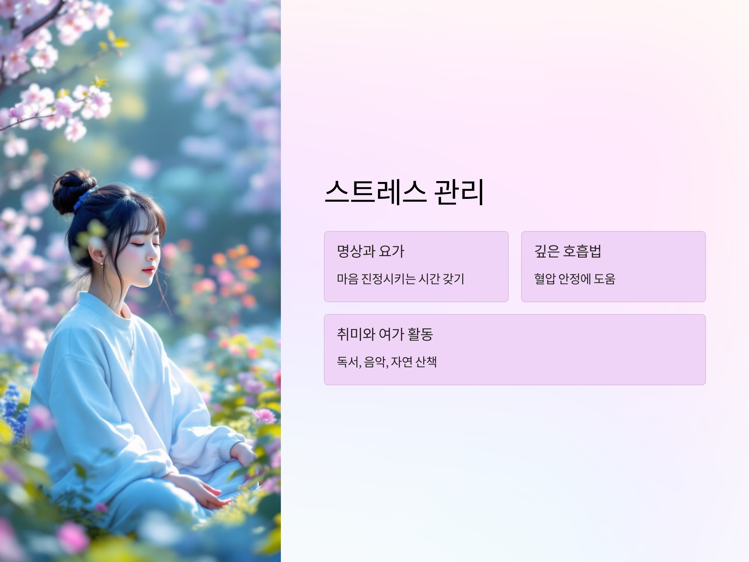 스트레스는 고혈압을 유발하거나 악화시키는 주요 원인 중 하나입니다. 직장이나 개인적인 문제로 스트레스가 심할 경우, 혈압이 높아질 수 있습니다. 스트레스 관리 방법으로는 명상, 요가, 깊은 호흡법 등이 효과적입니다. 하루 중 몇 분이라도 명상이나 심호흡을 하여 마음을 진정시키는 시간을 갖는 것이 중요합니다.