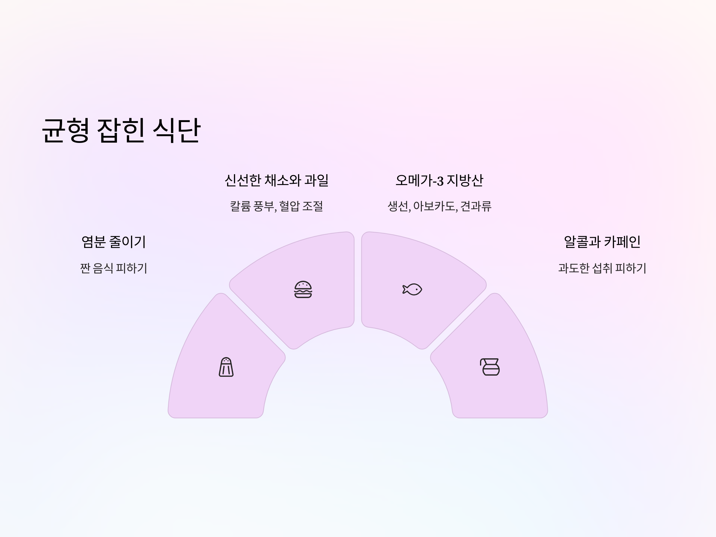 식단은 고혈압 관리에 중요한 역할을 합니다. 특히 염분(소금)의 섭취를 줄이는 것이 고혈압 예방에 효과적입니다. 지나치게 짠 음식을 피하고, 신선한 채소와 과일, 저지방 단백질이 포함된 식사를 하는 것이 좋습니다. 과일과 채소에는 칼륨이 풍부하게 들어 있어 혈압을 조절하는 데 도움이 됩니다. 또한, 오메가-3 지방산이 풍부한 생선, 아보카도, 견과류 등을 섭취하면 심장 건강을 지킬 수 있습니다.