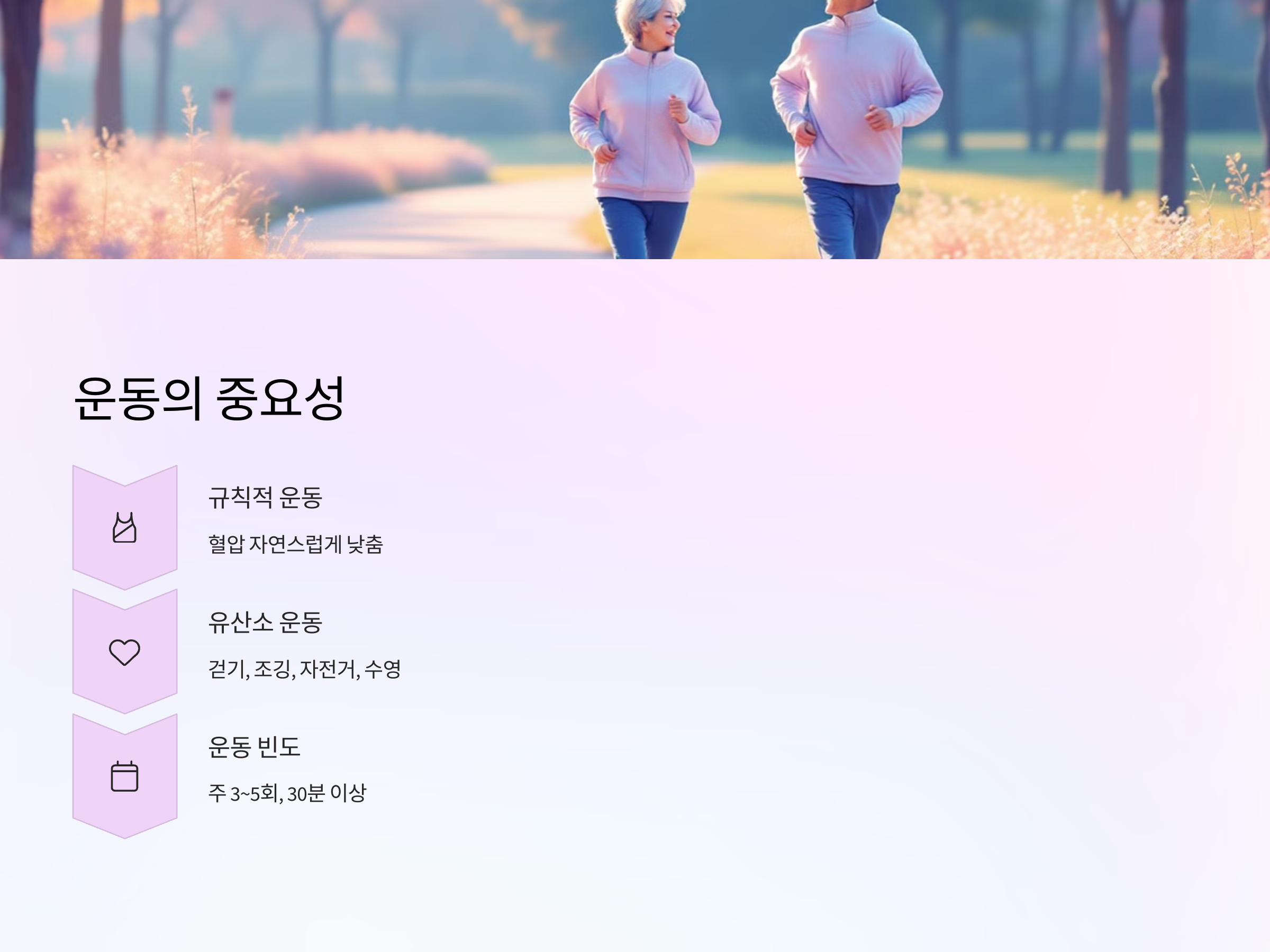 고혈압을 관리하는 데 가장 중요한 습관 중 하나는 규칙적인 운동입니다. 꾸준한 운동은 혈압을 자연스럽게 낮추는 데 큰 도움을 줍니다. 유산소 운동, 특히 걷기, 조깅, 자전거 타기, 수영과 같은 활동은 심장 건강을 향상시키고 혈액 순환을 개선하는 데 유익합니다. 운동은 심박수를 낮추고, 체중을 줄이며, 혈압을 안정시키는 효과가 있습니다.