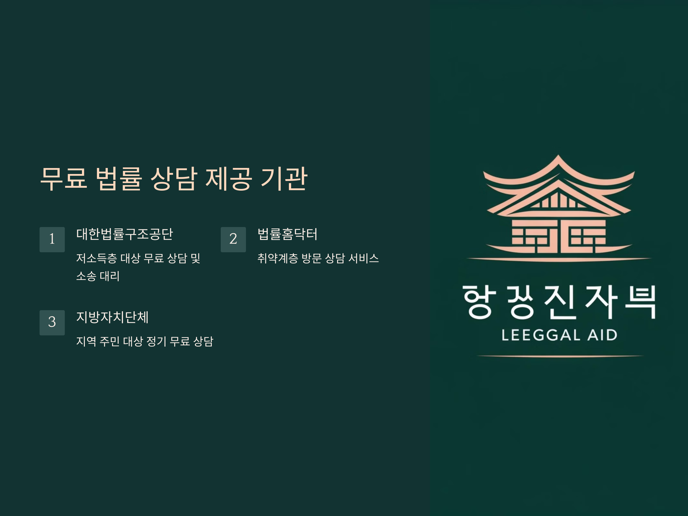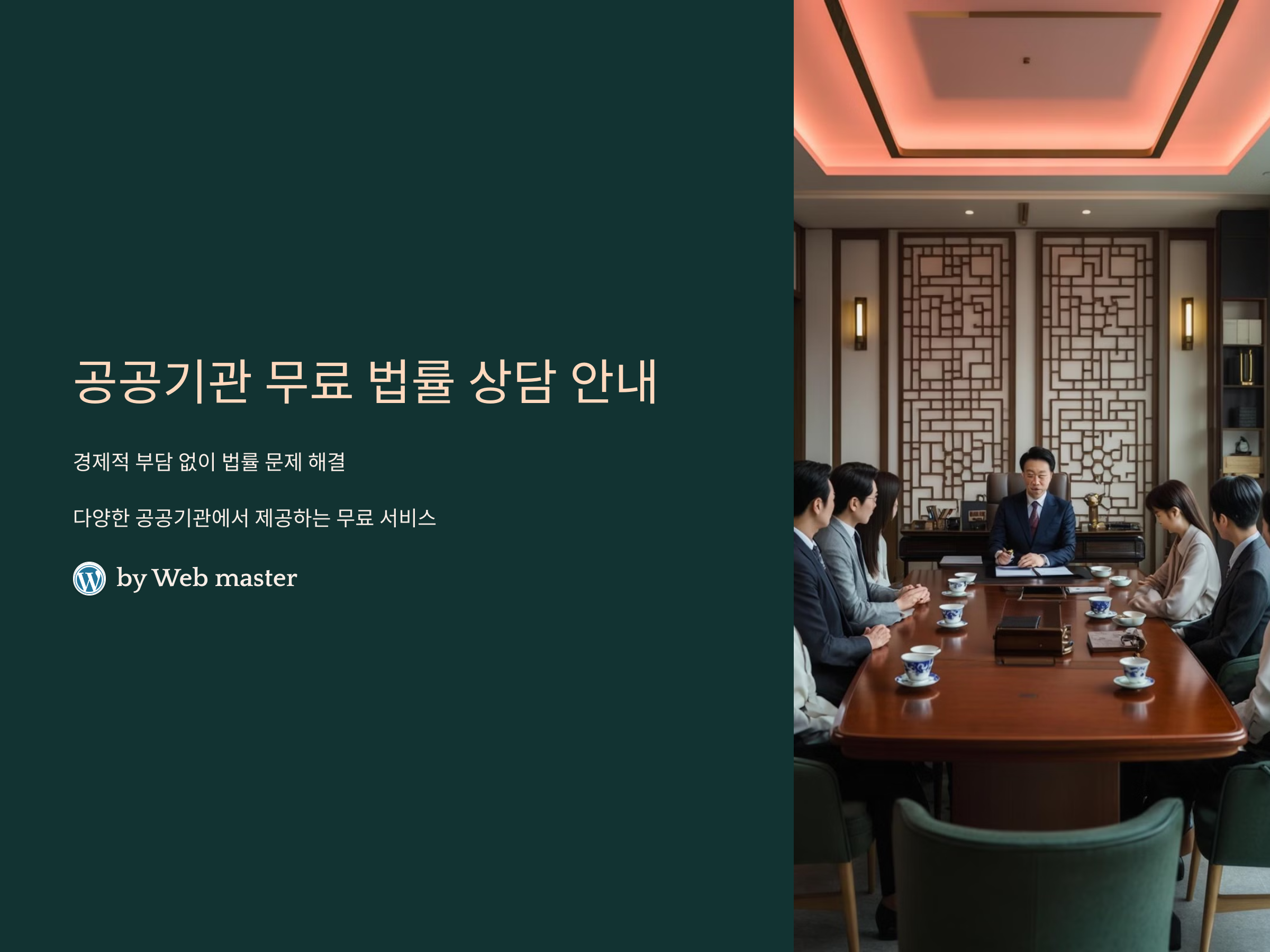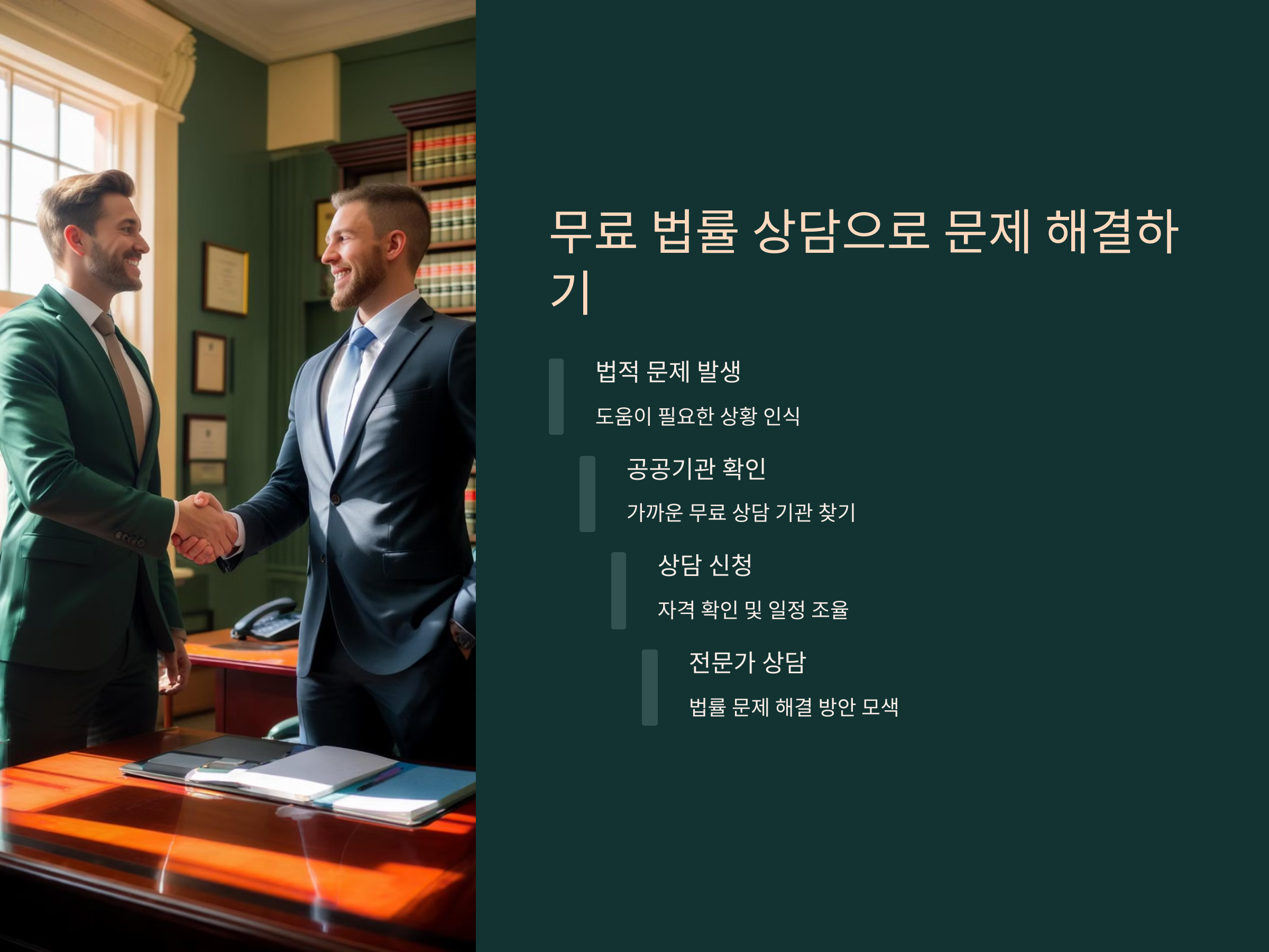 법적 문제로 고민하고 있다면, 가까운 공공기관을 찾아 무료 법률 상담을 신청해 보세요. 비용 부담 없이 전문가의 도움을 받아 문제를 해결할 수 있습니다.