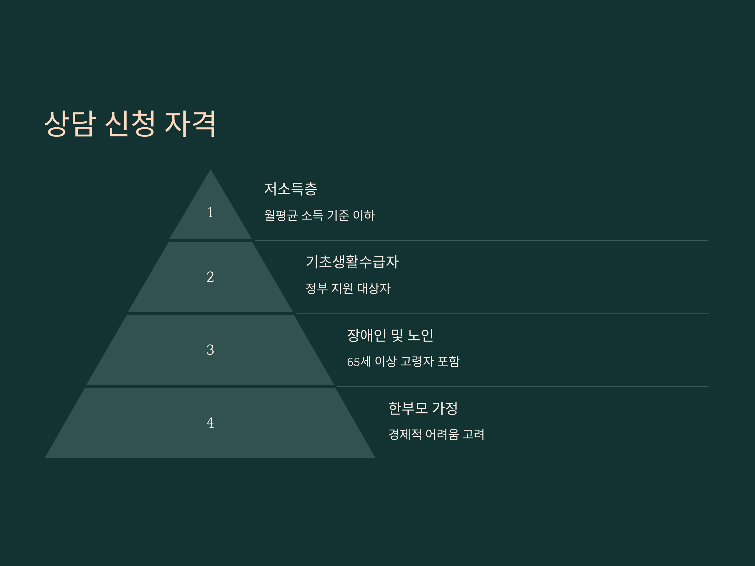 무료 법률 상담은 일정 자격 요건을 충족하는 사람들에게 제공됩니다. 주로 저소득층, 기초생활수급자, 장애인, 노인 등 취약 계층이 대상입니다.