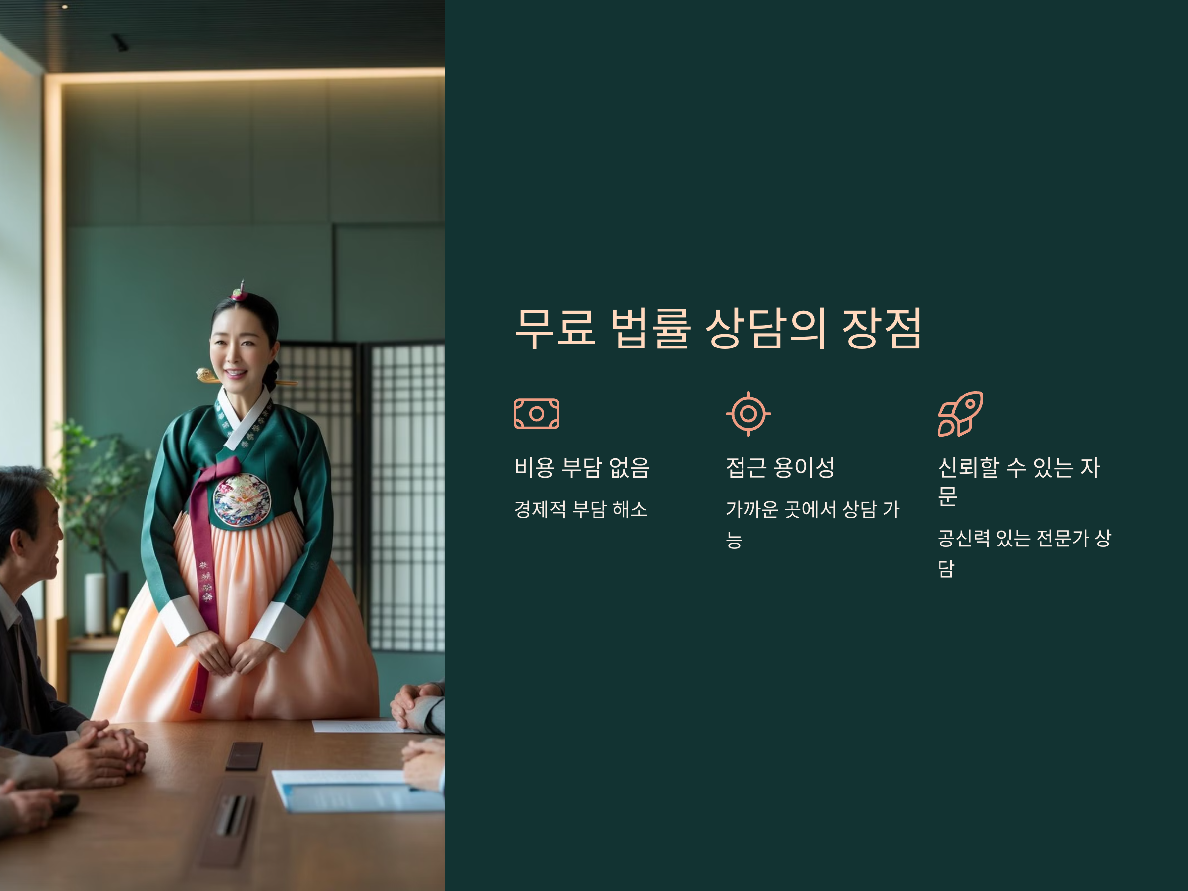 가장 큰 장점은 비용 부담이 없다는 점입니다. 법률 서비스를 받기 위해 변호사에게 많은 비용을 지불할 필요가 없으므로, 경제적인 부담을 덜 수 있습니다.
