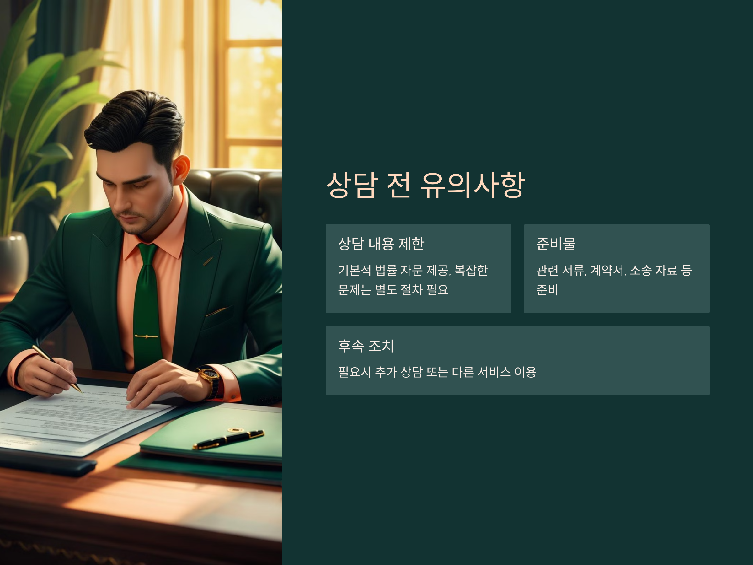 무료 법률 상담을 받기 전에 몇 가지 유의해야 할 점이 있습니다. 이를 알고 준비하면 상담을 더 효과적으로 이용할 수 있습니다.