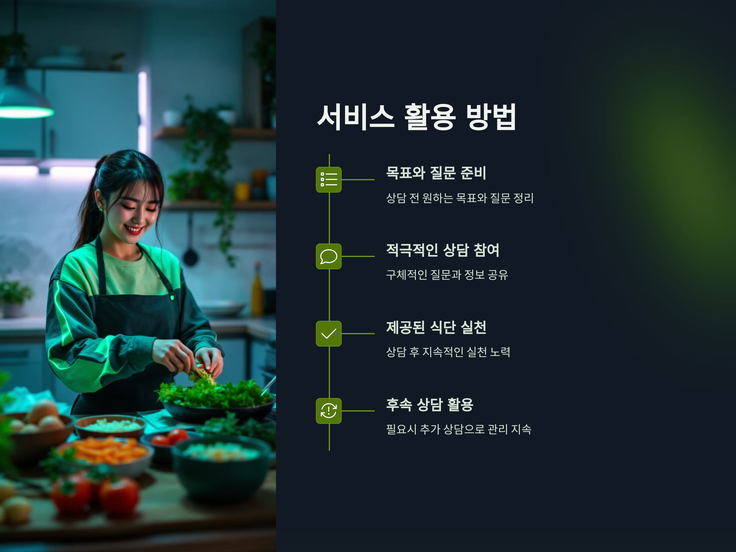 - 맞춤형 식사 제안: 개인의 건강 상태와 목표에 맞춘 식단을 제공